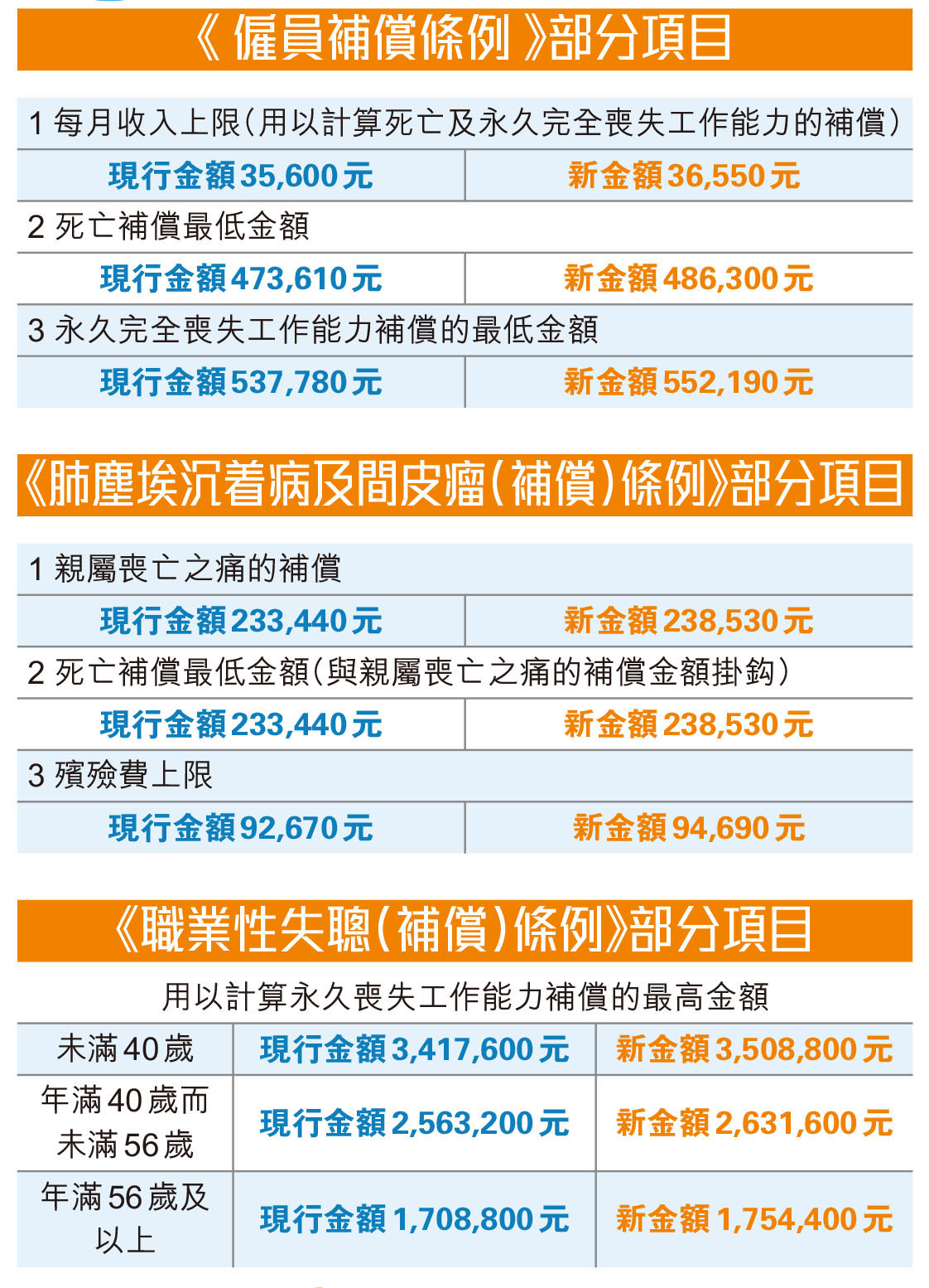 勞工處發言人表示:「按既定機制,《僱員補償條例》、《肺塵埃沉着病及間皮瘤(補償)條例》及《職業性失聰(補償)條例》所規定的補償金額,每兩年會視乎情況調整一次。如須作出調整,大部分補償項目的金額通常會參照在有關期間由名義工資指數所反映的工資變動或甲類消費物價指數所反映的物價變動,而個別補償項目的金額亦會參照其他相關因素而作出調整。」隨着今次調整,三條條例共18個補償項目的金額將會調高,增幅介乎2.18%至19.05%。