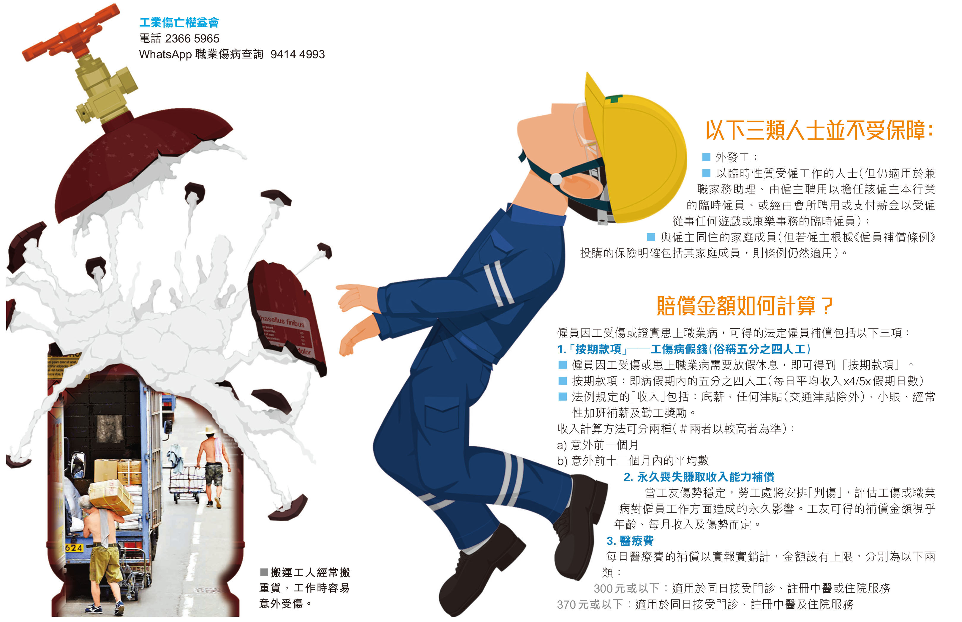 勞工處上月公布,因工受傷或患上《僱員補償條例》訂明職業病的僱員或已故僱員的家屬;罹患肺塵埃沉着病或間皮瘤的人士或因該等病死亡人士的家屬;以及罹患職業性失聰的人士可獲得的補償金額由今日起將獲調高。本文將一文睇清賠償詳情及計算方式。