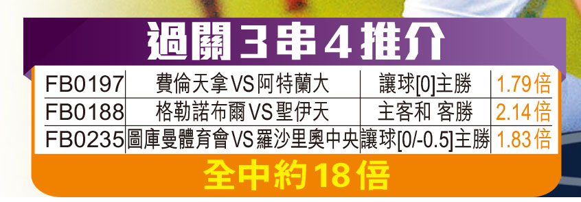 意甲今晚有中上游大戰上演,由近況大勇的費倫天拿主場迎戰實力分子阿特蘭大。費倫自2月中開始全面上力,愈戰愈勇,加上近年對賽佔得上風,今場又得地利,縱然牌面實力不及阿特蘭大,今場仍可秤先,足智彩開平手盤,博主勝坐走望贏,是過關穩膽之選。3串4串射聖伊天客勝及圖庫曼體育會上盤,全中有18倍之多,非常吸引。