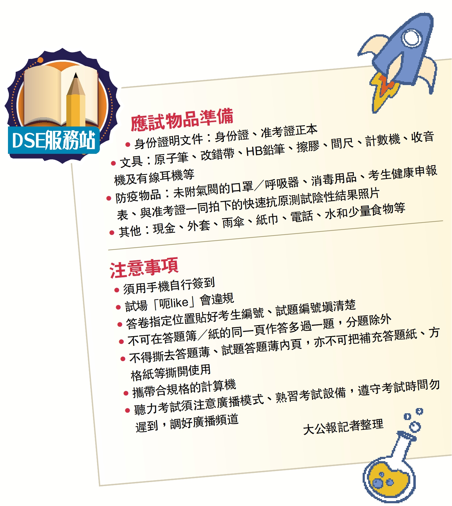 •文具:原子筆、改錯帶、HB鉛筆、擦膠、間尺、計數機、收音機及有線耳機等