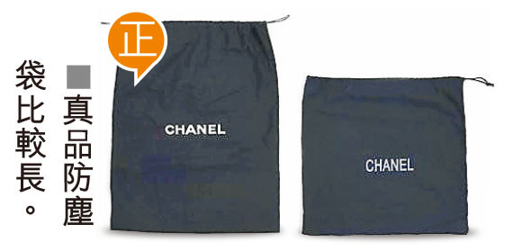 真品防塵袋比較長,單詞「CHANEL」居中,字體非常清晰,黑白對比鮮明。(部分)仿品防塵袋偏小,CHANEL往往不是嚴格居中,而是向一側偏斜。字體顏色不夠鮮明,比正品要暗淡。