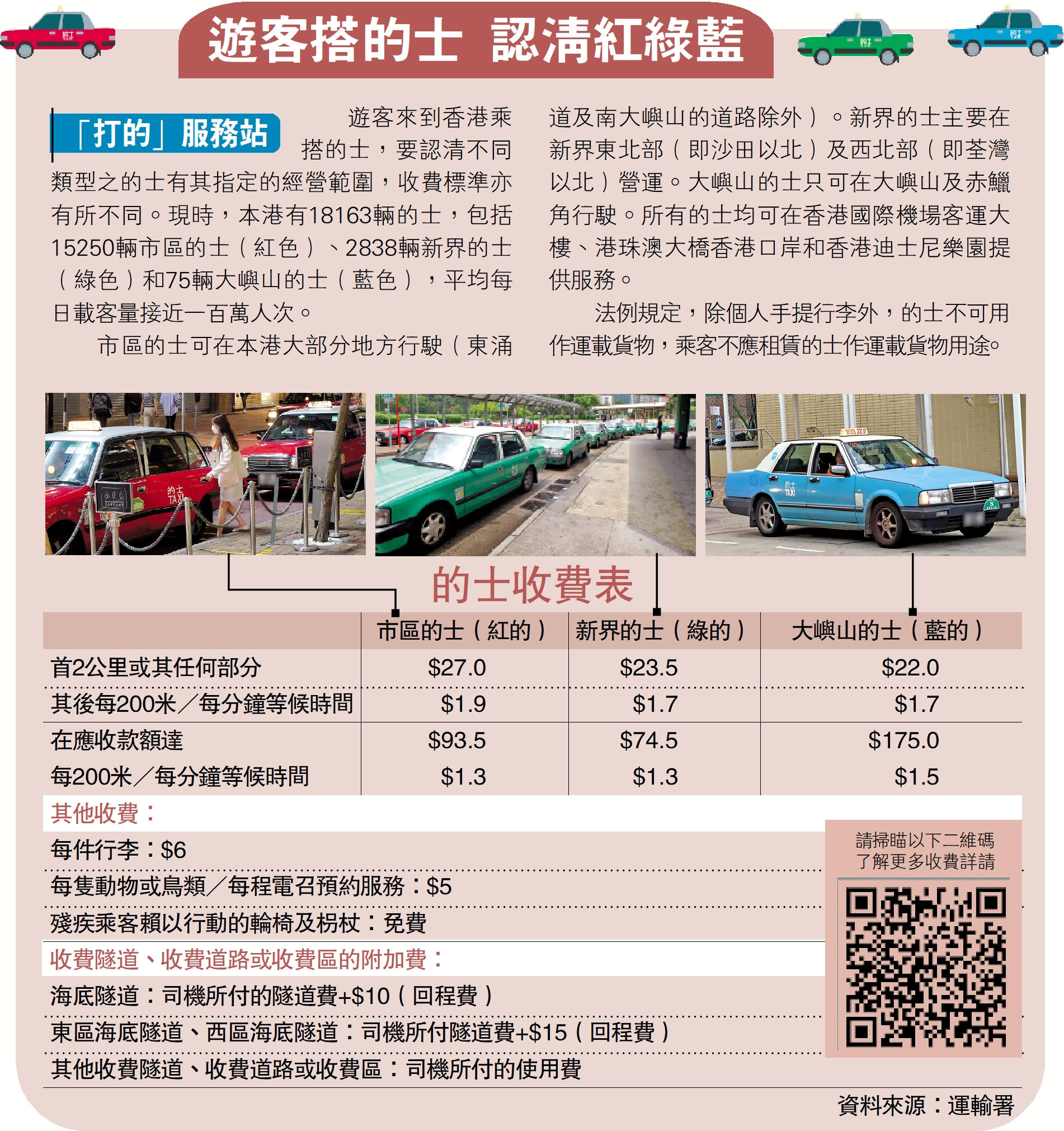 遊客來到香港乘搭的士,要認清不同類型之的士有其指定的經營範圍,收費標準亦有所不同。現時,本港有18163輛的士,包括15250輛市區的士(紅色)、2838輛新界的士(綠色)和75輛大嶼山的士(藍色),平均每日載客量接近一百萬人次。
