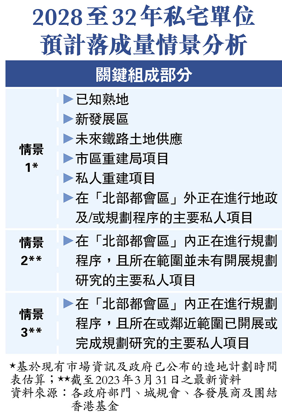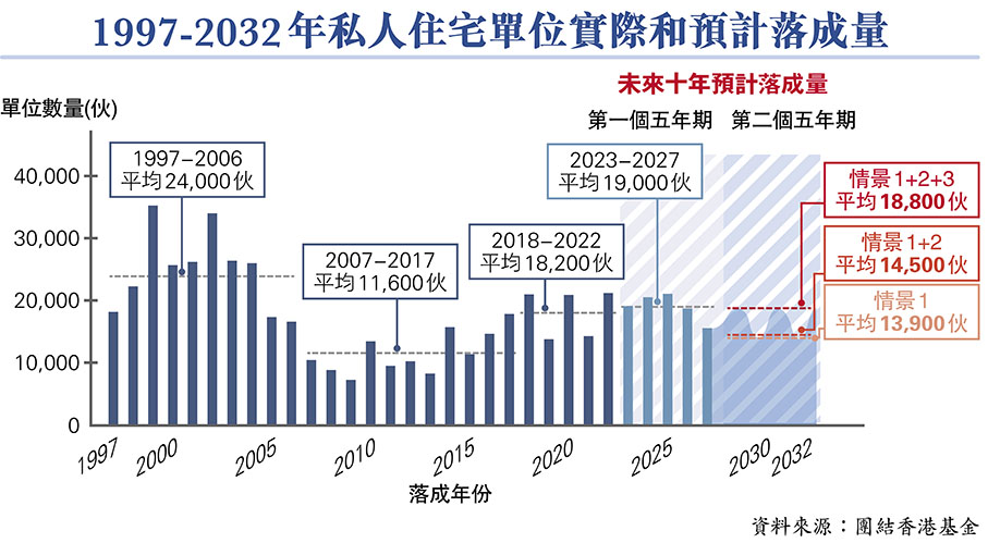 基金會前日發表的房屋供應預測,假設精簡發展程序等利好政策措施能成功落實,2023至2027年的私宅年均落成量將達1.9萬伙,較過去5年的1.82萬伙為多,數字亦遠高於2007至2017年均1.16萬伙水平。在最樂觀情景之下,假設「北部都會區」內所有規劃申請項目都能推進落實,2028至2032年間的年均落成量將達1.88萬伙;即使最悲觀情景亦有1.39萬伙,仍高過《長策》年均目標。