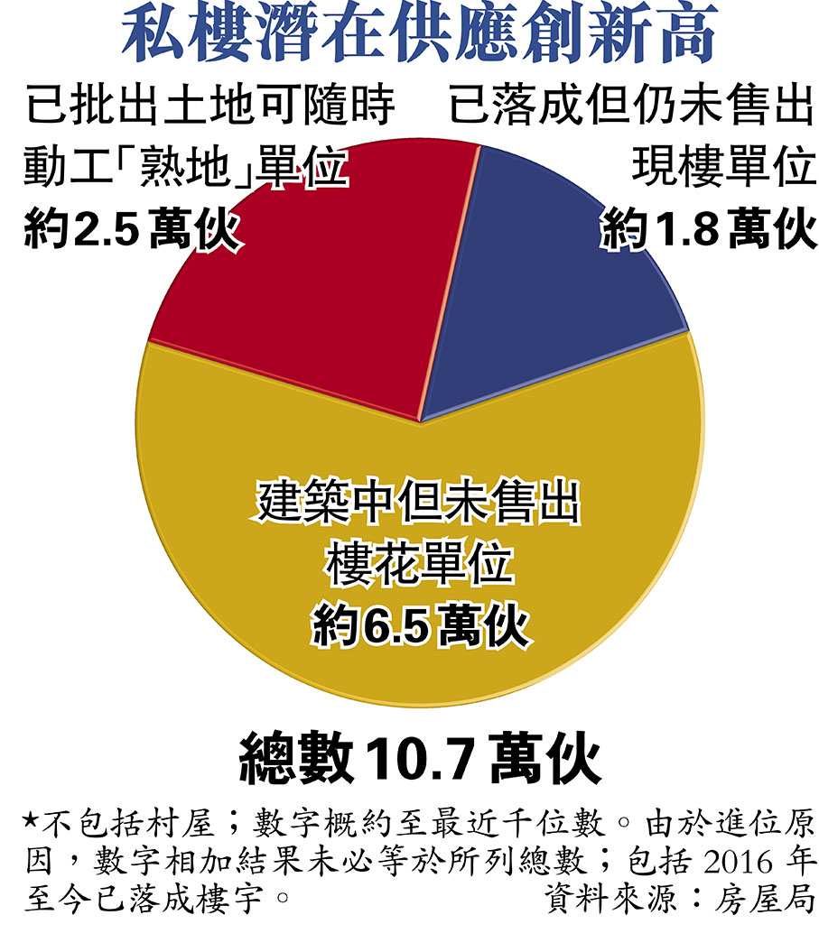 一手潛在私宅供應至3月底達10.7萬伙,較去年12月底增加約2,000伙,主要由於已落成但仍未售出的現樓單位有約1.8萬伙,按季多出約2,000伙或12.5%,創2007年初後新高。已批出土地可隨時動工的「熟地」單位有約2.5萬伙,按季增加約2,000伙或8.7%。至於建築中但未售出的樓花單位則有約6.5萬伙,按季減少約1,000伙。