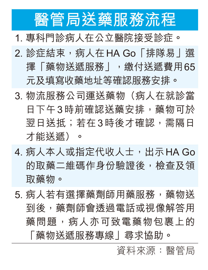 醫管局昨介紹全新的「藥物送遞」服務,醫管局總藥劑師李成章表示,使用有關服務的病人如常在醫院診症,其後只要在「HA Go」手機應用程式上選擇送藥服務,無須等攞藥,藥物之後會送到家中或指定地址。他表示,病人若在就診當日下午3時前確認送藥安排,藥物可於翌日送遞;下午3時後確認,就隔日送遞。病人亦可隨時在「HA Go」查閱送遞進度。