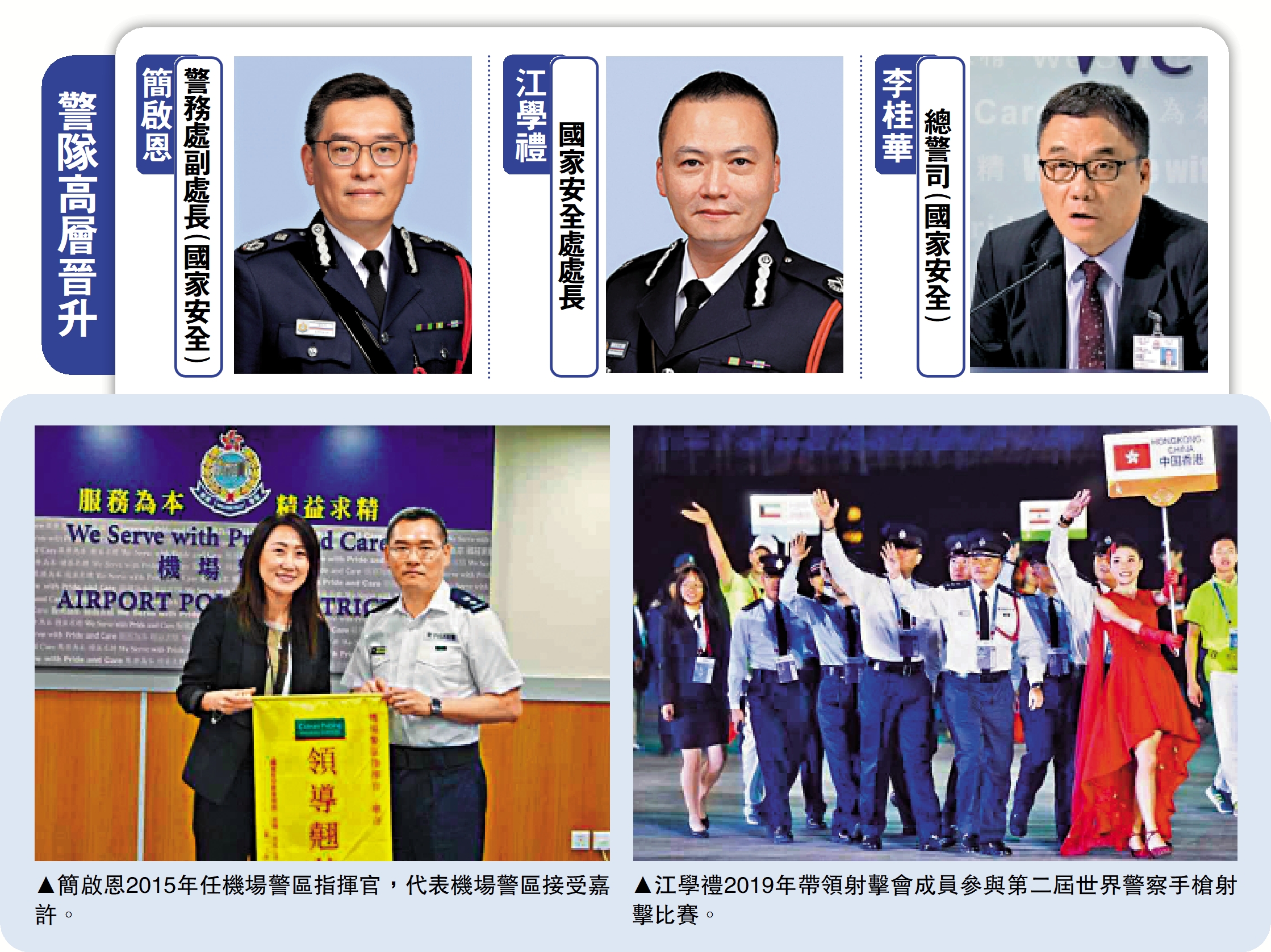 行政長官李家超昨日按香港國安法第十六條第二款,任命簡啟恩為警務處維護國家安全部門負責人,以及根據《基本法》第四十八(七)條任命李桂華為總警司(國家安全);而江學禮則獲警務處處長擢升為高級助理處長,出任國家安全處處長,接替簡啟恩。