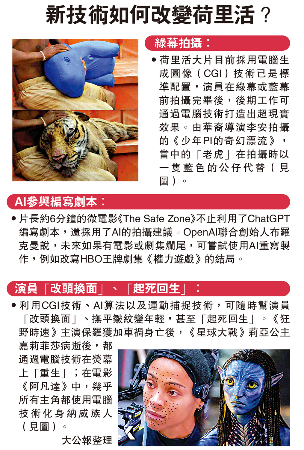 •荷里活大片目前採用電腦生成圖像(CGI)技術已是標準配置,演員在綠幕或藍幕前拍攝完畢後,後期工作可通過電腦技術打造出超現實效果。由華裔導演李安拍攝的《少年PI的奇幻漂流》,當中的「老虎」在拍攝時以一隻藍色的公仔代替(見圖)。