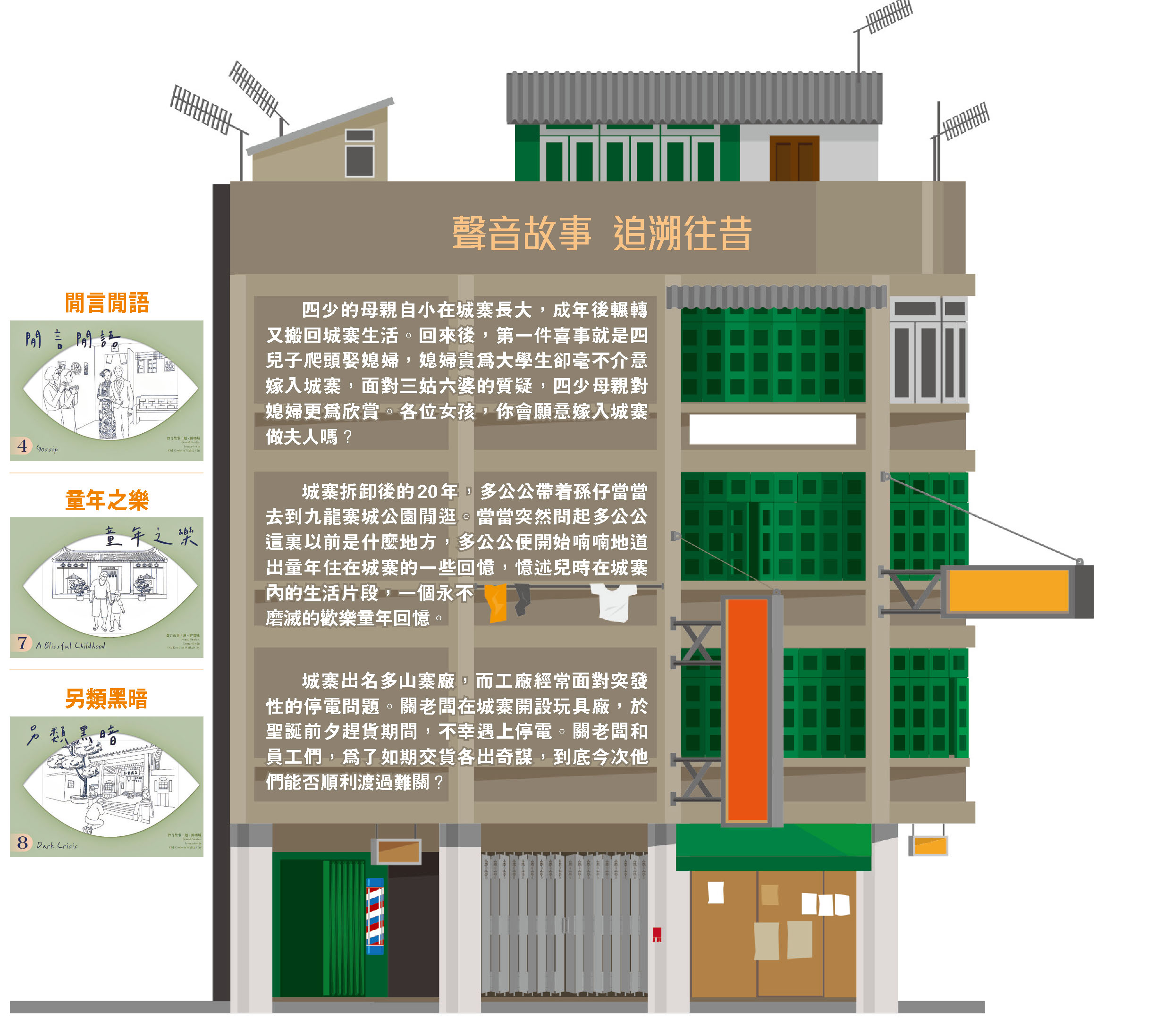 展覽展出的10個聲音故事,以寨城生活為切入點,主題涵蓋無牌醫生、山寨廠、買賣房屋、童年玩樂、供水不穩、潮州人過節等趣事,反映居民苦中帶甜的草根生活。故事的創作其來有自,全部來自街坊的親身分享。有人童年時經常進出寨城,與朋友在裏面玩得不亦樂乎;有人因工作認識了「發展商」,遂在城寨置業;有人曾接下山寨廠的外發工作,賺取零用錢。這些故事不同於史書記載,全是生活瑣碎之事,卻從另一角度讓大家了解寨城的過去