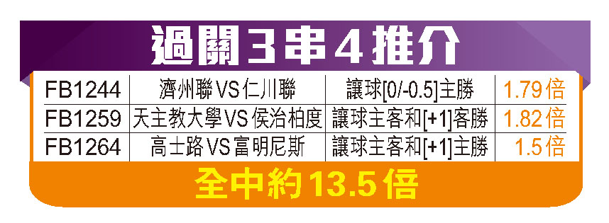 韓職周中開快車,今日又有三場大戰上演,其中上仗打開今季主場勝利之門的濟州聯,將會於地頭迎戰剋星仁川聯。不過,正所謂寧買當頭起,成功取得相隔265日的主場勝仗,近期狀態大勇的濟州聯今場應可秤高一線,只小讓平半,上盤是今日過關重心。玩三串四再過落侯治柏度的[+1]客勝,以及高士路的[+1]主勝,全中有13.5倍,可以一試。