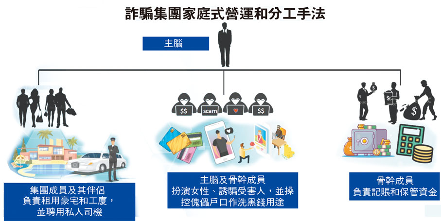 被捕的10男5女本地騙徒,包括一家五口,年齡介乎22歲至70歲。43歲男主腦報稱在長沙灣工廈經營網媒公司,替人製作及剪輯影片,骨幹成員包括主腦的兄長,報稱在機場任職地勤。兩兄弟負責詐騙「營運」,其餘骨幹包括兩兄弟的70歲母親,負責協助處理贓款,兩兄弟的女友則負責租用沙田複式豪宅。