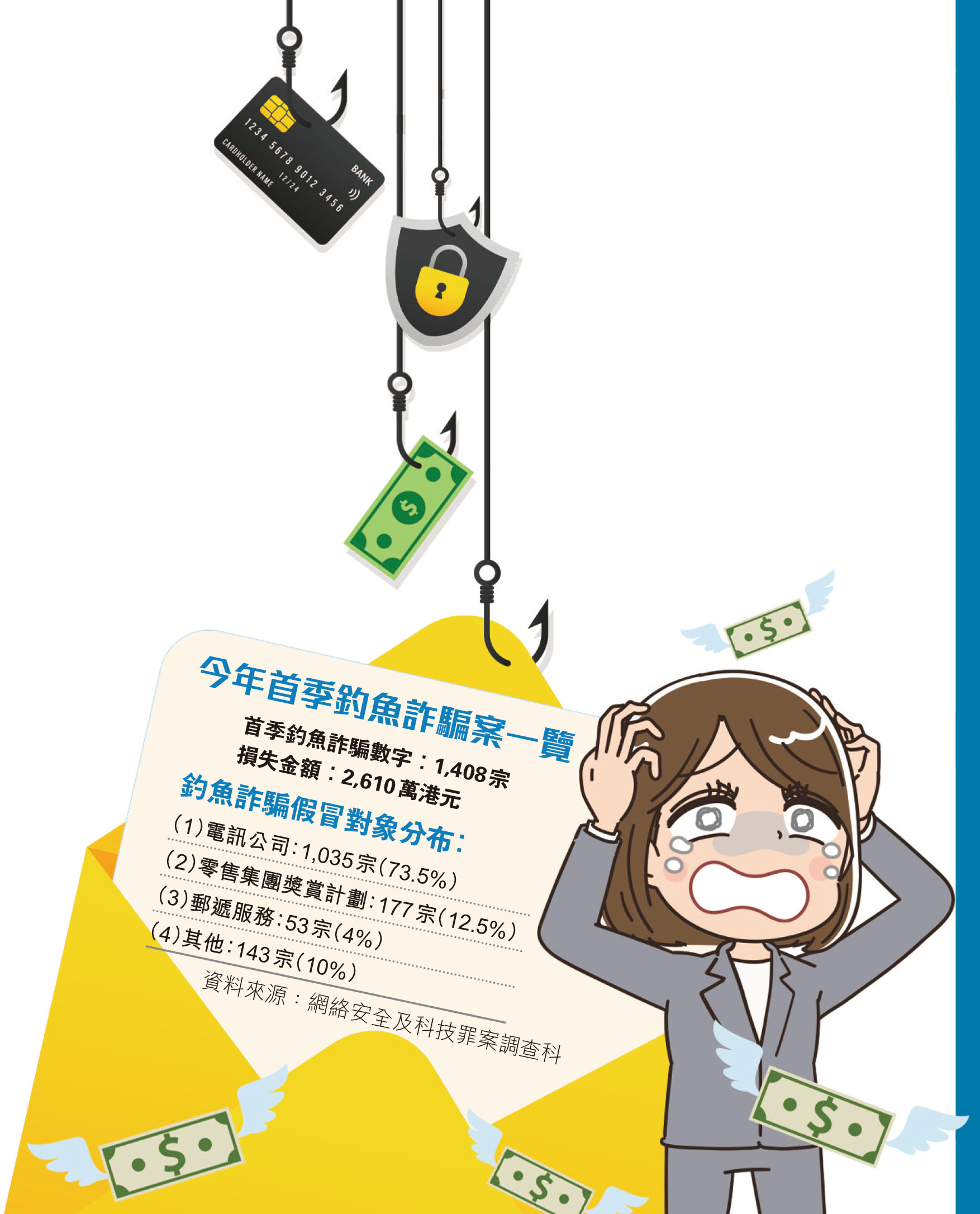 全球每日有多達350億個釣魚訊息充斥網絡世界。香港警方在今年首季錄得1,408宗釣魚短訊詐騙案,佔同期香港整體科技罪案兩成,損失金額2,610萬元。有受害人在今年情人節收到假冒電訊商的釣魚短訊,聲稱會員積分將到期須盡快換禮品,她不虞有詐進入假網站後,發現用積分加一元便可換取藍牙耳機,並輸入個人及信用卡等資料。翌日收到銀行短訊通知其信用卡被人進行兩項共2.4萬元交易,始知受騙及報警。另一名會計師同樣中招,損失70萬元。此外,有大學生玩虛擬貨幣被「釣走」250萬元。