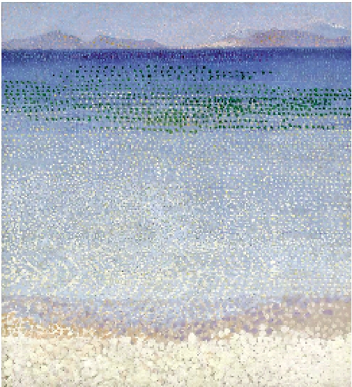 畫面製造出一種令人身臨其境的錯覺──腳下是金黃的沙粒,漸次往前看是泥沙混雜的海水,遠眺可見深藍的海水和粉中帶紫的山脈。技法上,克羅斯採用大面積塊狀的筆觸進行點描創作,並且控制點狀筆觸的大小,又在不同色塊及水平交界處,運用更細小的圓點,以增加畫面的層次,製造景深。這種獨特的技法也被後人視為野獸派與立體主義的先驅。