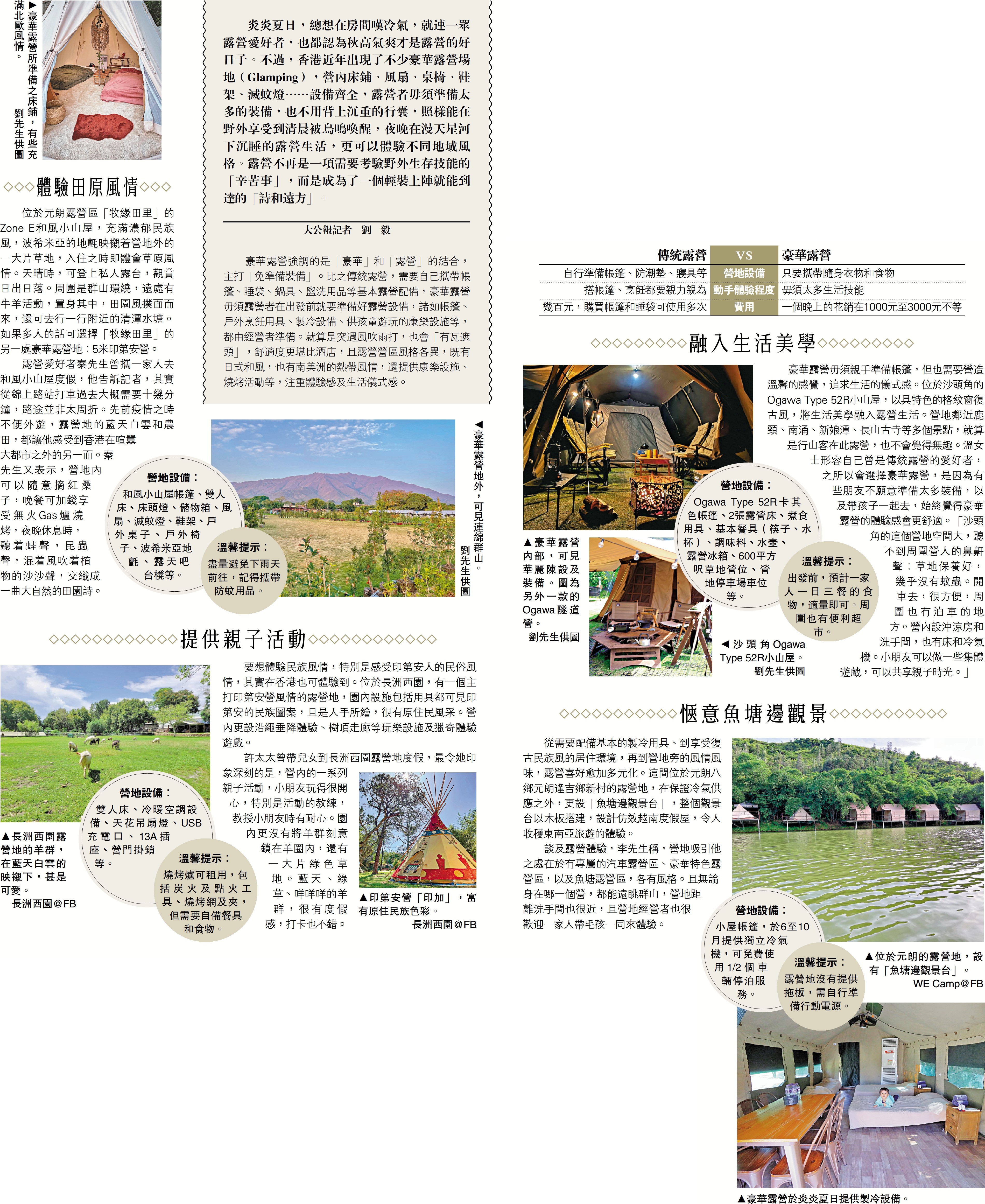 炎炎夏日,總想在房間嘆冷氣,就連一眾露營愛好者,也都認為秋高氣爽才是露營的好日子。不過,香港近年出現了不少豪華露營場地(Glamping),營內床鋪、風扇、桌椅、鞋架、滅蚊燈……設備齊全,露營者毋須準備太多的裝備,也不用背上沉重的行囊,照樣能在野外享受到清晨被鳥鳴喚醒,夜晚在漫天星河下沉睡的露營生活,更可以體驗不同地域風格。露營不再是一項需要考驗野外生存技能的「辛苦事」,而是成為了一個輕裝上陣就能到達的「詩和遠方」。\大公報記者 劉 毅