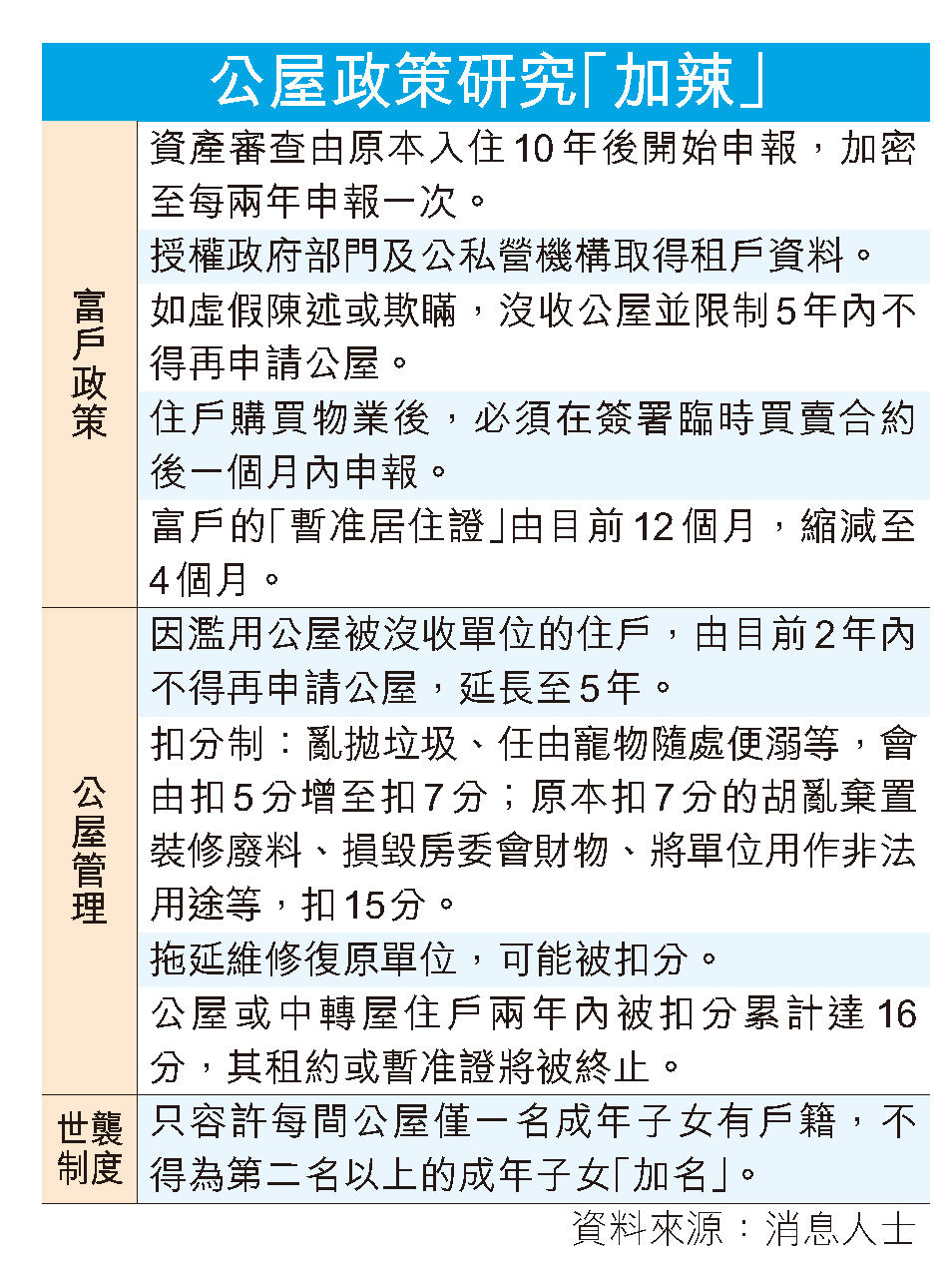 同時,房委會亦計劃加強公屋管理。目前,公屋住戶若兩年內扣滿16分就會終止租約。消息指,扣滿分的規定不變,惟扣分行為「加辣」,例如亂拋垃圾、任由寵物隨處便溺、胡亂棄置裝修廢料、以及損毀或盜竊房委會財物等,「加辣」至分別由扣5分及7分,增至扣7分及15分。換言之,若住戶亂拋垃圾3次,又或破壞單位設施重犯一次,就有可能被「叮走」。