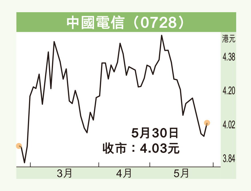 中電信自5月初高位4.58元(港元,下同),回落至3.91元後已見承接,昨收報4.03元,升1.77%,成交額2.73億元。現價市盈率11.91倍,息率5.49厘,市賬率0.76倍,估值吸引,乃短中線投資佳選,上望4.58元。