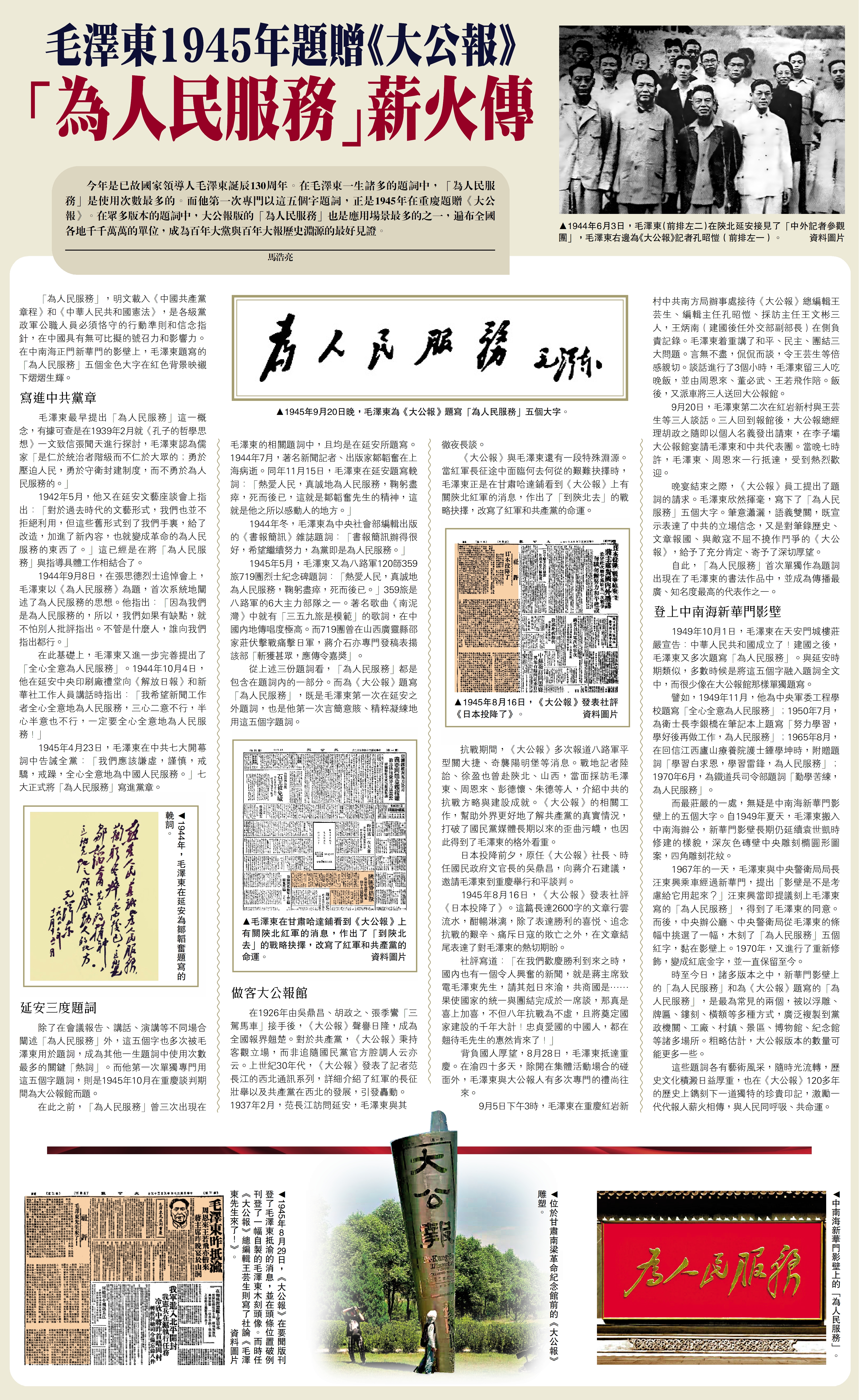 毛澤東1945年題贈《大公報》「為人民服務」薪火傳