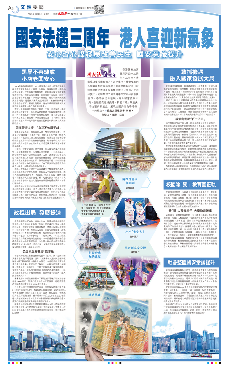 香港國安法實施即將迎來三周年。三年來,香港成功實現由亂到治,市民生活、社會發展的各個層面都展現新面貌。香港文匯報記者日前訪問曾飽受香港亂局影響的市民分享自己生活的變化,同時整理了過去幾年在安定的社會氛圍下,香港在民生發展、融入國家發展大局、整體國安意識提升、校園「獨」聲消失等方面的新氣象,展現出國安法為香港帶來的裨益。◆香港文匯報記者 林熹、