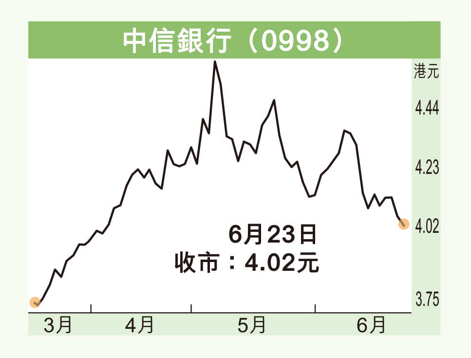 港股在過去兩個月大幅下滑,內銀估值跌至吸引水平。中信銀行(0998)今日除淨,基於該行盈利增幅高於同業,除淨後的短中線投資價值吸引,可趁跌市收集。