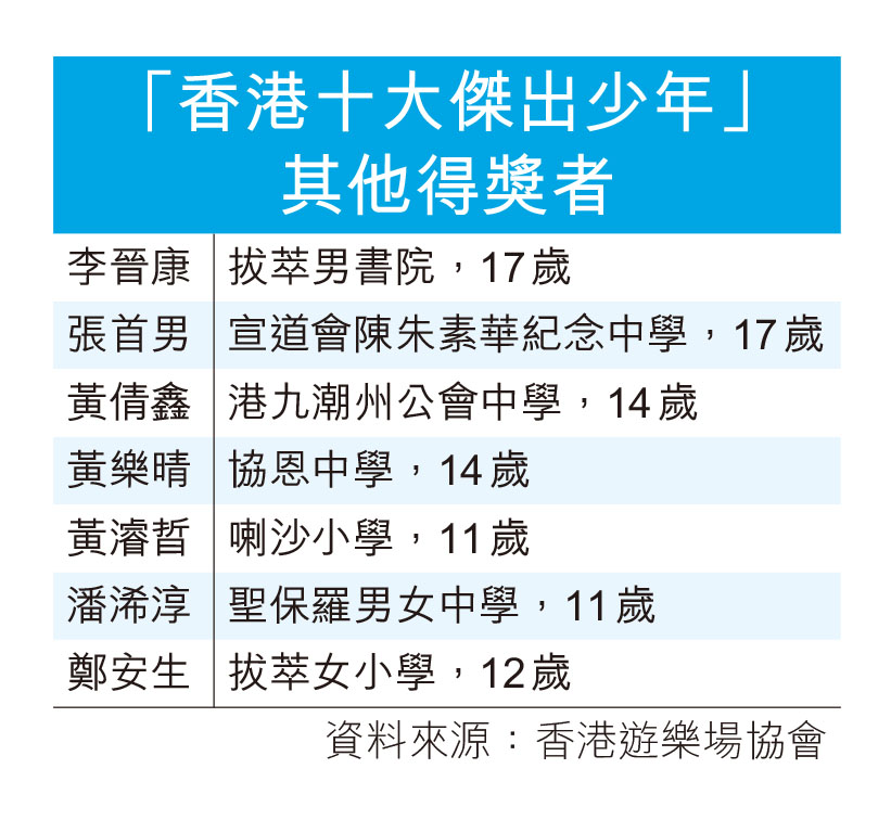 由香港遊樂場協會主辦、每兩年一屆的「香港傑出少年選舉」昨舉行頒獎禮,10名「香港十大傑出少年」和20名「香港傑出少年」在家長和提名人陪同下領取殊榮。有獲選「十大傑少」女生於中二時患上大病致顱內出血和中風,連站立、進食、說話都做不到。不過她靠着不屈不撓的意志力,撐過艱苦的物理治療,從輪椅上站起來重新走路,也克服了術後視物出現重影等多重障礙,堅持繼續學業。未來她希望擔任醫療相關職業,日後幫助更多和她經歷同樣困難的人。