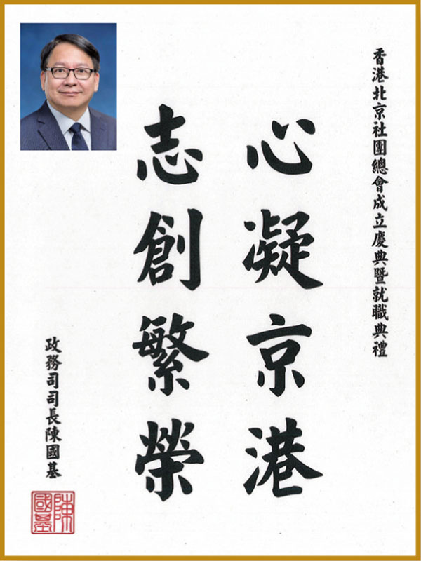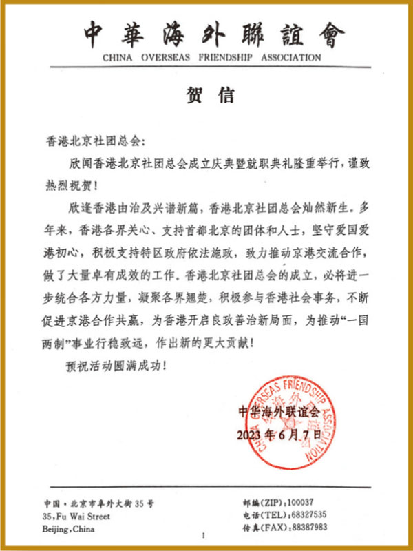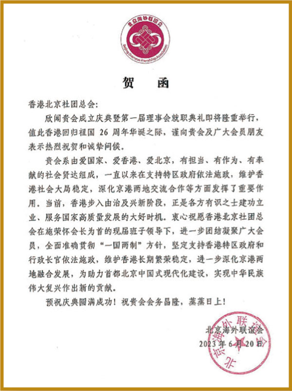 黨的二十大的勝利召開吹響了以中國式現代化推進中華民族偉大復興的時代號角,香港在新一屆特區政府引領下守正創新,展現出「愛國者治港」新氣象,「一國兩制」實踐站在了新的歷史起點。站在新的起點,抓住新的機遇,擔負起新的使命和擔當,為進一步團結引領在港北京鄉親社團、在港北京機構、企業及愛國愛京愛港人士,聯動發力,共創美好未來,正值香港回歸祖國26周年前夕,我們一起組成香港北京社團總會。