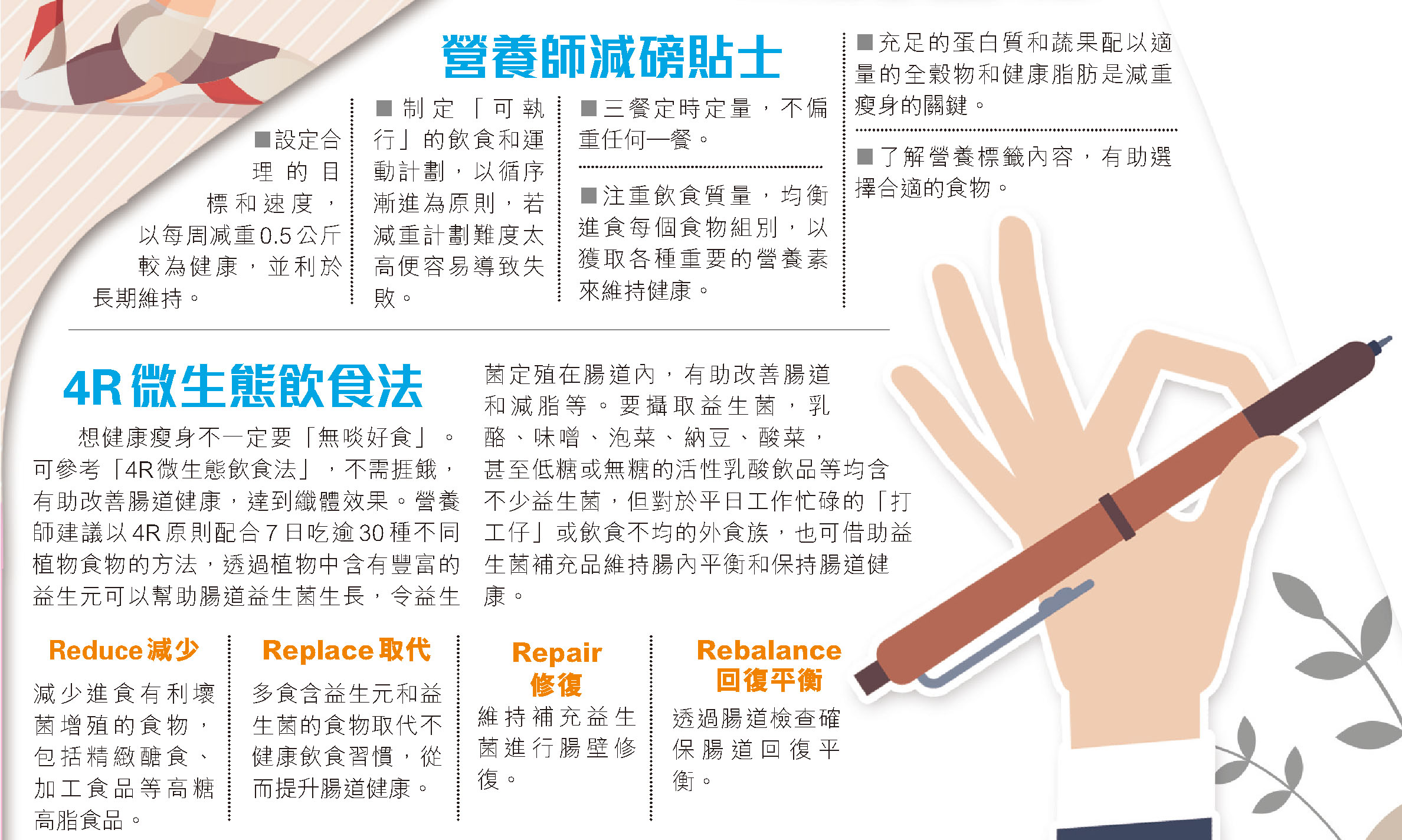 結婚是人生大事,不少準新人在婚前都會積極展開減肥大計,務求在大日子以最佳狀態示人。而大多數人減肥的方式都是從飲食入手,坊間就有不少提供瘦身營養餐的公司,然而消委會卻發現這些營養餐單營養素含量與檢測結果不符。其實要健康減磅,並非只有捱餓減餐,也可自行烹調營養餐或參考專家推介的「4R微生態飲食法」,安全搣脂。