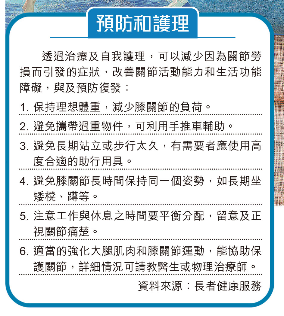 其實,初期軟骨損傷不嚴重時,膝關節炎的症狀是有機會可逆轉的,只要改善有關危險因素,如控制體重,減低不必要的膝關節壓力,再把肌肉訓練起來,仍有機會回復膝蓋健康。不少醫學研究亦顯示,於關節炎初期配合適當運動及藥物,可有效減輕痛楚和促進活動能力。運動種類可分為肌肉強化訓練和帶氧運動,強化膝關節是避免膝關節提早老化最好方法。經過強化耐力或重力鍛煉,有助身體活動時保持關節穩定,在執行各種動作時,膝蓋有足夠的力量來承托。而帶氧運動如游泳,是幫助保持一定體重,強化肌腱的耐力訓練,都是保健膝蓋最好的運動。不過,近年也有文獻指出,與獨自運動相比,膝關節炎患者,在物理治療師或專業人士的督導及帶領下,所進行的運動效果更為有效。研究建議,每周進行最少3次肌力強化運動,持續最少8星期,能有效改善關節痛症及提升生活質素。除了恒常運動,均衡飲食和體重控制,也有助減低膝關節於活動時所承受的壓力,繼而紓緩痛楚。