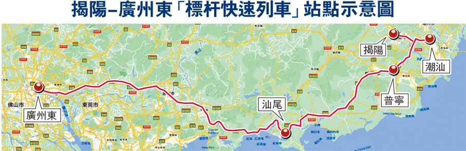在今年9月底廣汕高鐵開通時,揭陽市將同步開行揭陽至廣州東始發終到「標杆快速列車」三對,使用時速350公里動車組;列車間經梅汕線、杭深線、甬廣高鐵汕廣段以及廣深線運行,中途僅經停潮汕、普寧、汕尾三個站點,單程運行時間不超過2小時40分,直通廣州中心城區,較目前車程節省約80分鐘。