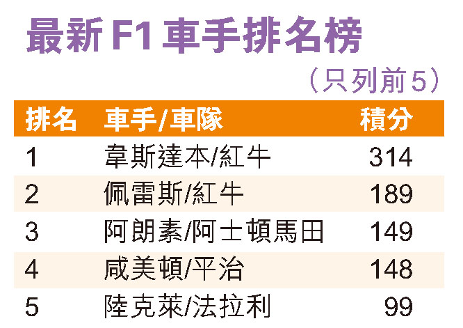 可能是F1史上最缺乏競爭性的賽季,昨晨在比利時站,紅牛車隊再一次展現他們大超班實力,因為違例啟用賽季第五台波箱而被罰後退5位的「新車神」韋斯達本,儘管排第6位起步,最終卻是自第17圈起便重返首位,然後直帶到終點,連續第8站贏得冠軍。「韋少」在今季12中贏出10站,紅牛車隊更是創歷史單季12連勝,相當誇張。