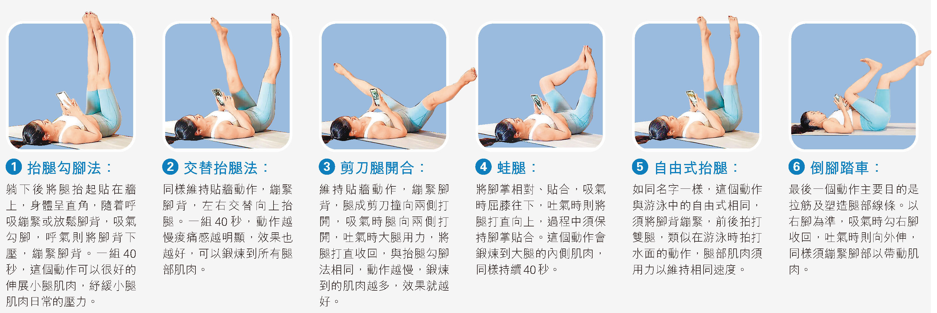最後一種簡易瘦腿法適合在睡前進行,利用睡前滑手機的時間,只要每天睡前花約6分鐘,進行以下6組動作,一組40秒,難度不高,相當適合初學者、新手,讓你躺着也能練出纖細美腿。