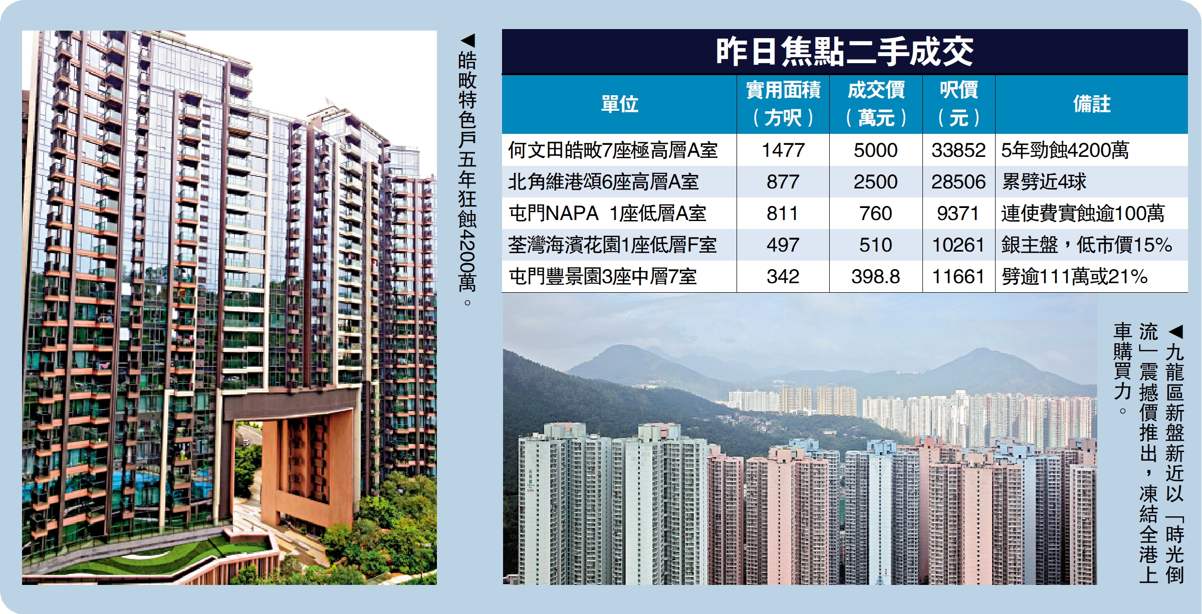 上址業主實蝕的4200萬元是什麼概念?假設每期六合彩頭獎800萬元計,也要中足5次;若以全城樓市新貴親海駅Ⅱ所有開放式戶型折實320萬元有找計,夠買13伙。