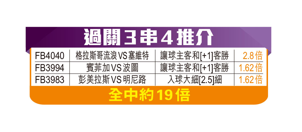 至於3串4尾關揀自由盃的16強次回合巴甲內戰,彭美拉斯首回合作客1:0贏明尼路,今場返回主場出戰,必會踢得謹慎;明尼路剛戰巴甲贏波,是他們各項賽事近11場首勝,狀態有限,火力不足,今場博[2.5]入球細最穩陣。(開賽時間:周四8:30am)