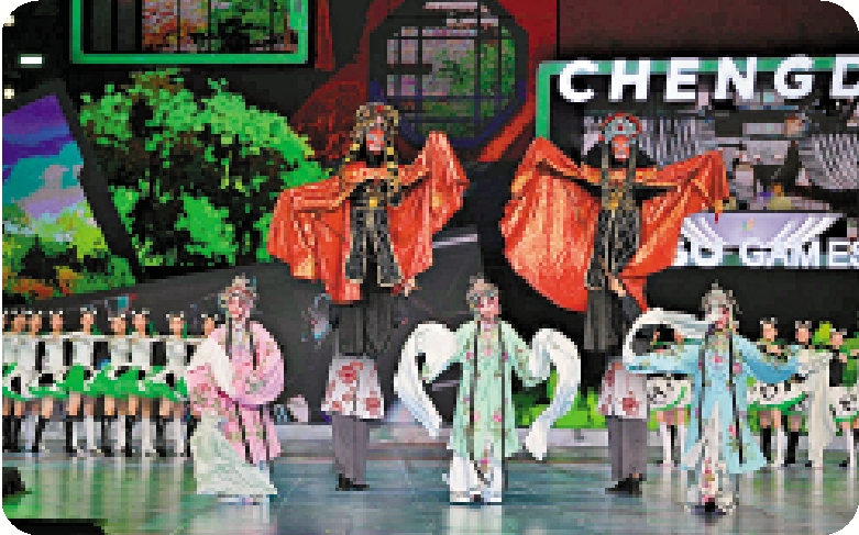 亮眼的紅色披風、顏色各異的臉譜、靈活多變的姿勢,配合着頗具時尚感的改良川劇音樂,亮相閉幕式的川北大木偶變臉,讓人驚嘆。表演者托舉着近40斤的大木偶,巧妙運用各種動作和手法,以極快的速度同時轉換5種臉譜,一招一式乾淨利索。事實上,2018年平昌冬奧會閉幕式「北京8分鐘」節目中,兩隻高2米45的川北發光熊貓大木偶,就曾驚艷世界。