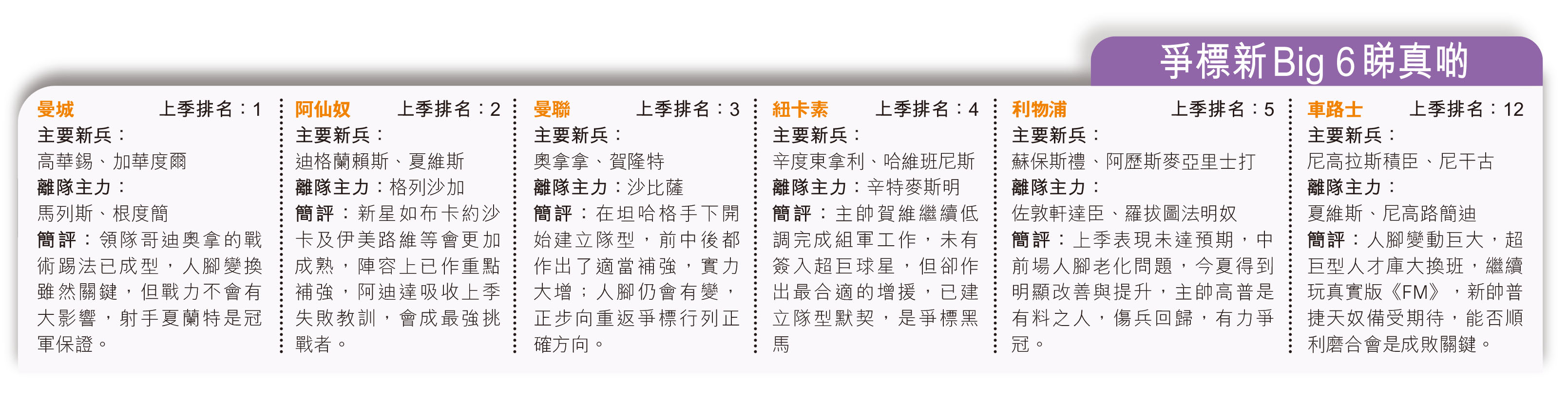 全球最受歡迎的英超明日開咧,能夠挑戰曼城冠軍地位的球隊,相信沒有幾多。今日《香港仔波經》為大家簡單分析6支最具爭標機會球隊實力與變化,與傳統Big 6有少許不同,換上新帥普斯迪高路執教的熱刺,已被足智彩列作50倍冷門,反而全球最富貴球隊紐卡素經過上季的驚喜表現,可取而代之成為新Big 6一分子。