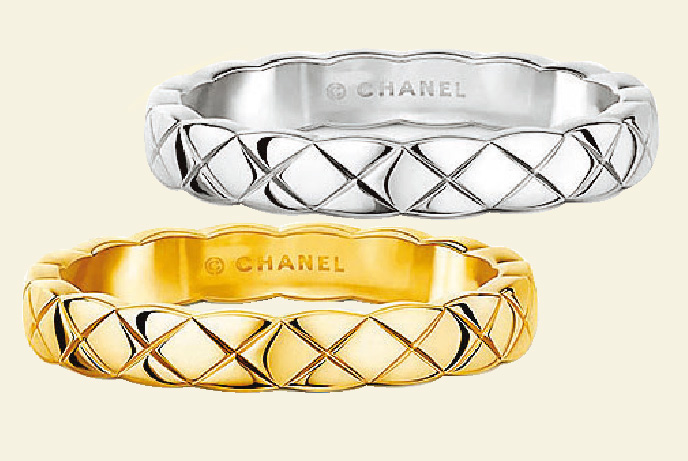 近期新鮮出爐的CHANEL Coco Crush成為了最熱門的結婚對戒選擇。幼身的菱格紋線條簡約大方,而菱格紋是CHANEL的標誌圖案,其幾何造型令此系列更別具一格,展現優雅氣息,且辨識度極高,價錢由9,900元起。