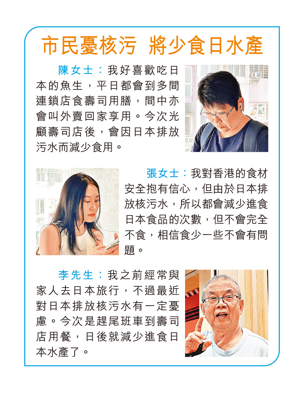 記者在現場所見,仍有不少市民到場選購壽司、刺身等日本海產,但他們只看包裝盒內的食品情況和比較價格,未有細閱產地來源。有女顧客表示,昨日在超巿售賣的日本水產應是日本排放核污水前運抵本港,故到超市購買喜愛的海膽,但之後會盡量避免進食日本水產食品,同時會繼續留意當局公布的檢驗數據。