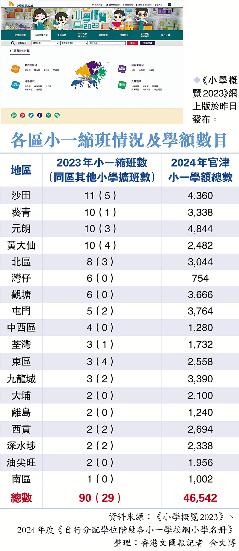 2024年9月入學的小一收生流程昨日開始,香港文匯報記者翻查《小學概覽2023》網上版發現,在全港超過500所小學中,有79所小學要在今學年合共減少90班小一,尤以沙田區減班最為嚴重,共縮減11班小一。區內的循理會美林小學、九龍城浸信會禧年(恩平)小學及香港道教聯合會純陽小學更分別縮減了2班小一,葵青區、元朗區及黃大仙區亦分別減少了10班。