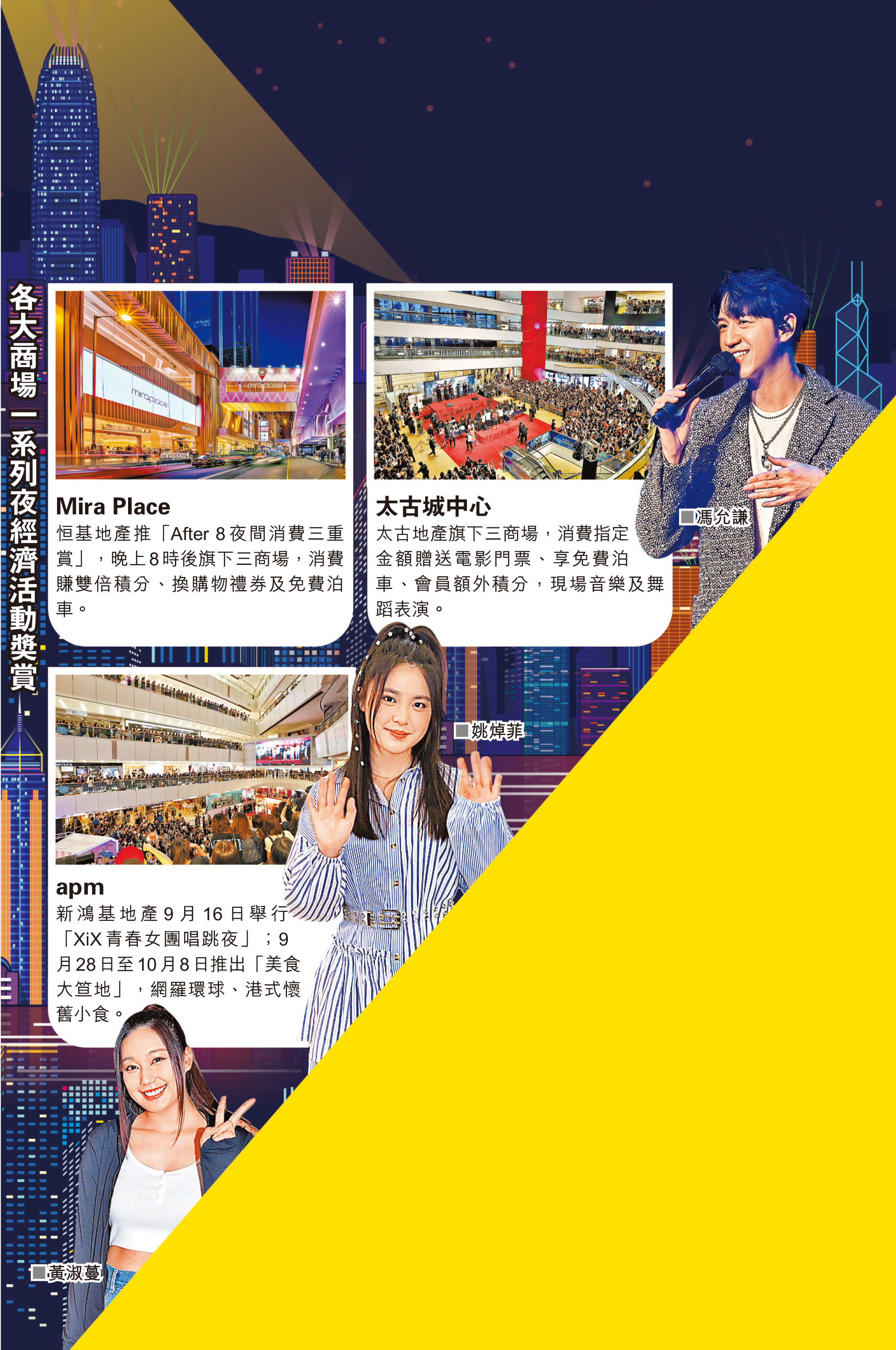 為響應政府推動夜間經濟,香港各大商場趁中秋節、國慶節及啤酒節快將來臨積極參與。繼華懋、新地等集團外,恒基及太古地產昨亦宣布旗下商場加入推動夜間消費活動。恒地旗下尖沙咀Mira Place、將軍澳MCP新都城中心及馬鞍山MOSTown新港城中心齊推連串特色活動如音樂會、市集及派逾萬張商場電子購物禮券;太古旗下太古廣場、太古城中心及東薈城名店倉,即日亦推晚間優惠,包括送電影門票、消費享免費泊車及現場音樂及舞蹈表演等,務求增加商場及區域人流,帶旺整體市場氣氛。