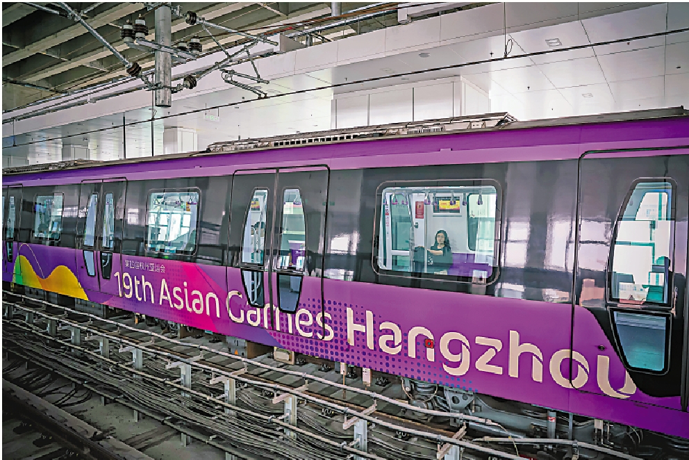 杭州地鐵「亞運號」專列車體上繪製有杭州亞運會元素。「亞運號」專列運用於連接了杭州蕭山國際機場、杭州火車東站、杭州火車西站三大交通樞紐的杭州地鐵19號線,為杭州市民與海內外賓客展現流動的亞運風景線,點綴城市的亞運氛圍。