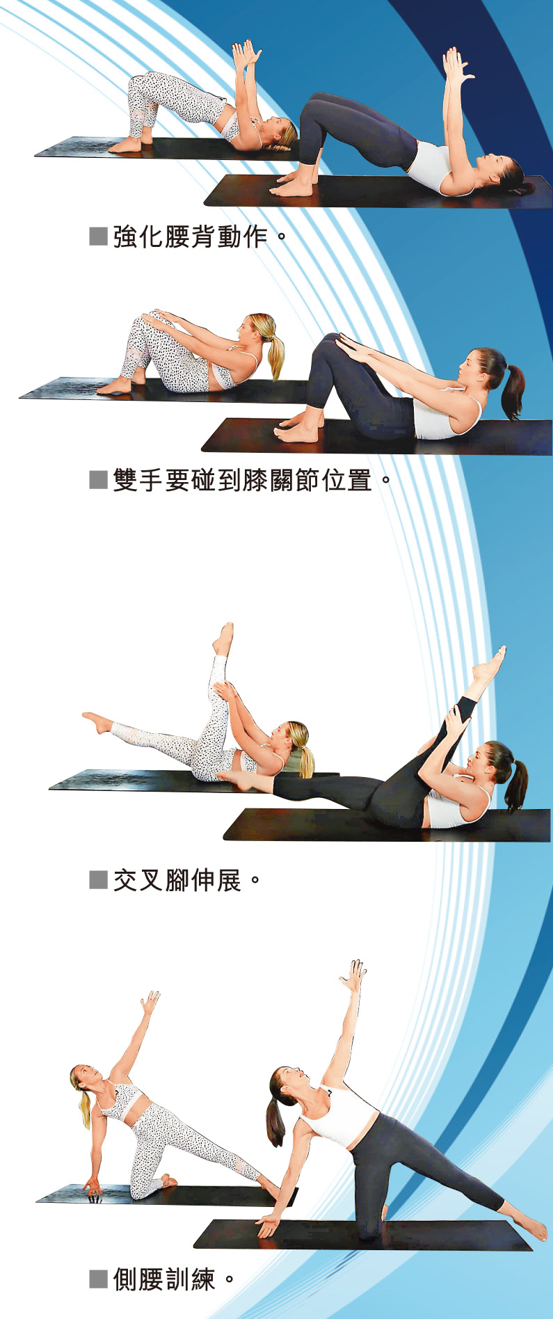 做法:先單腳跪於瑜伽墊上,另一隻腳向旁邊伸直,用核心肌肉保持身體平衡,雙手大字形向外伸展,眼看向前方,用腰力慢慢向側面上下來回擺動,重複15次;另一邊同樣進行15次。