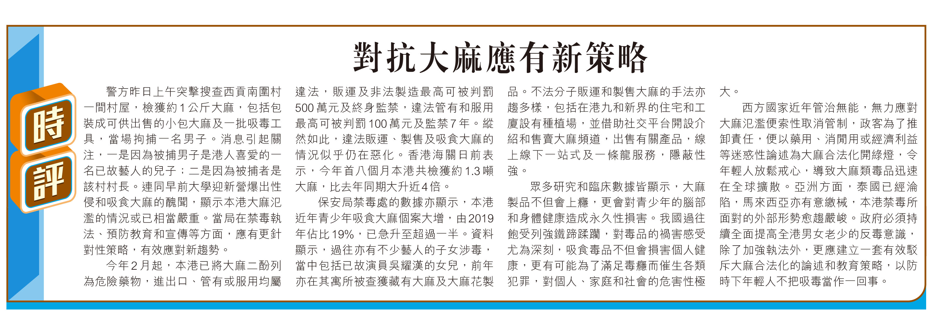 西方國家近年管治無能,無力應對大麻氾濫便索性取消管制,政客為了推卸責任,便以藥用、消閒用或經濟利益等迷惑性論述為大麻合法化開綠燈,令年輕人放鬆戒心,導致大麻類毒品迅速在全球擴散。亞洲方面,泰國已經淪陷,馬來西亞亦有意繳械,本港禁毒所面對的外部形勢愈趨嚴峻。政府必須持續全面提高全港男女老少的反毒意識,除了加強執法外,更應建立一套有效駁斥大麻合法化的論述和教育策略,以防時下年輕人不把吸毒當作一回事。