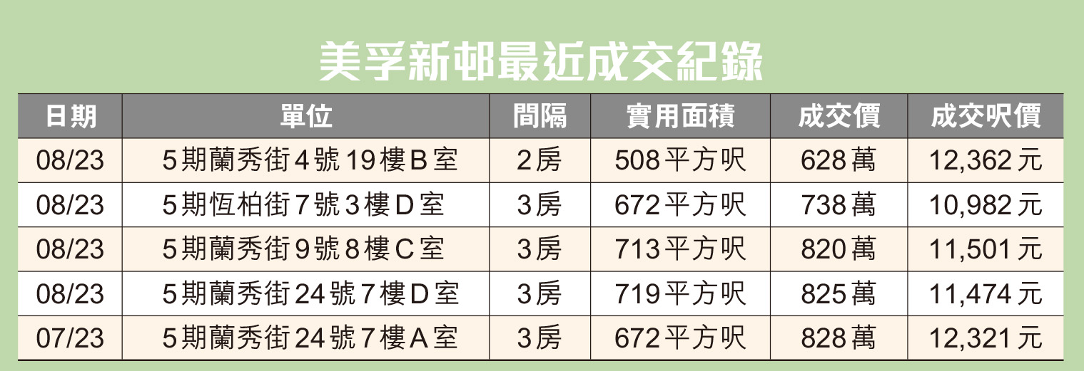 美聯物業美孚新邨3期分行區域聯席董事邱漢榮表示,是次放售單位為5期恆柏街1號低層B室,屬優質2房間隔,景觀為向南內園景。他並稱,本月美孚暫錄得二手成交12宗,實用平均呎價為10,438元。買家則為區內換樓客及分支家庭。