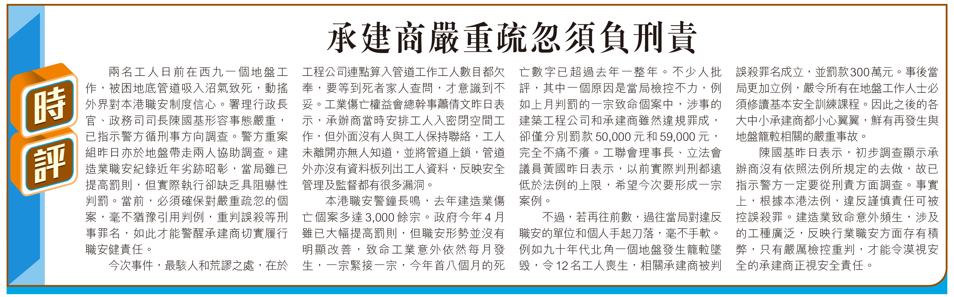 兩名工人日前在西九一個地盤工作,被困地底管道吸入沼氣致死,動搖外界對本港職安制度信心。署理行政長官、政務司司長陳國基形容事態嚴重,已指示警方循刑事方向調查。警方重案組昨日亦於地盤帶走兩人協助調查。建造業職安紀錄近年劣跡昭彰,當局雖已提高罰則,但實際執行卻缺乏具阻嚇性判罰。當前,必須確保對嚴重疏忽的個案,毫不猶豫引用判例,重判誤殺等刑事罪名,如此才能警醒承建商切實履行職安健責任。