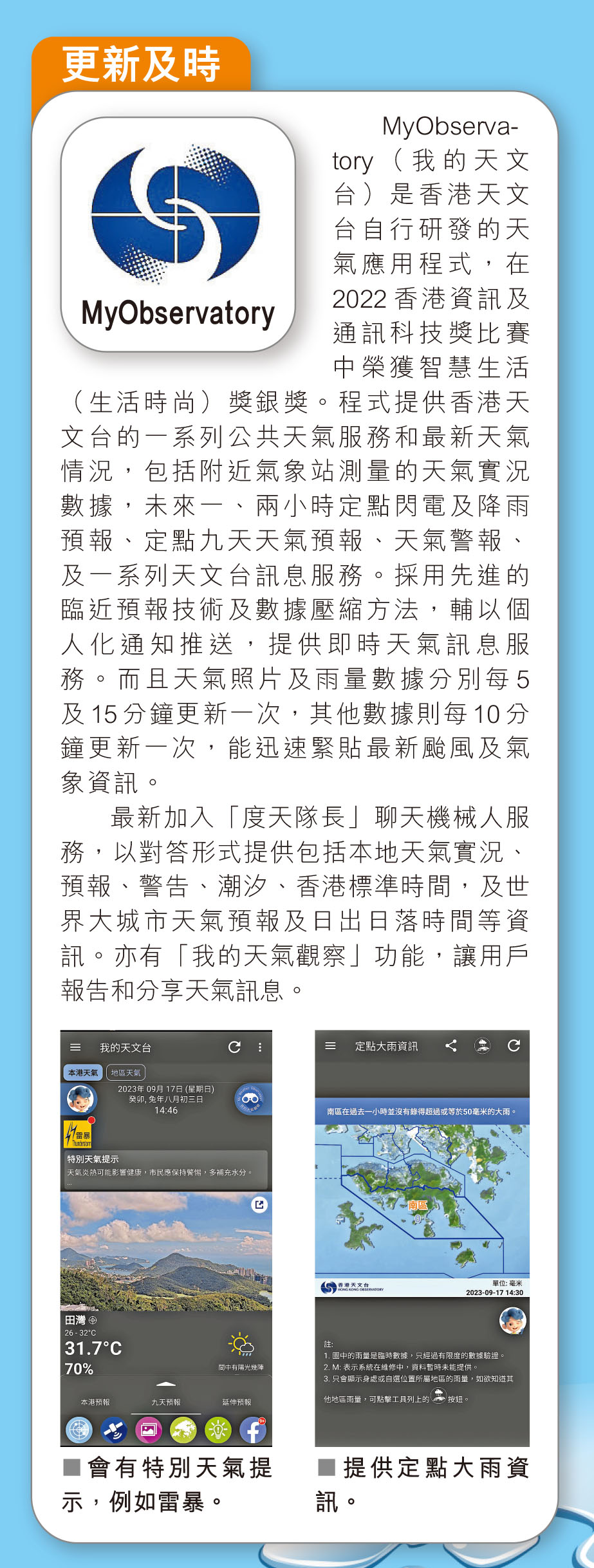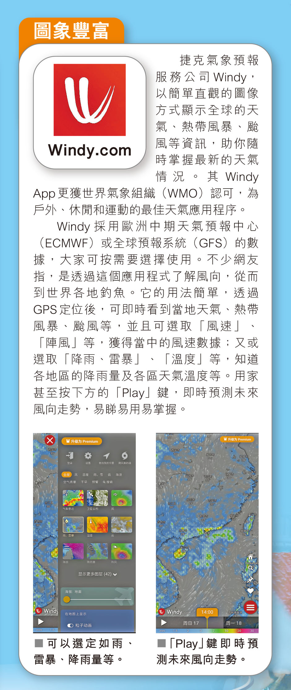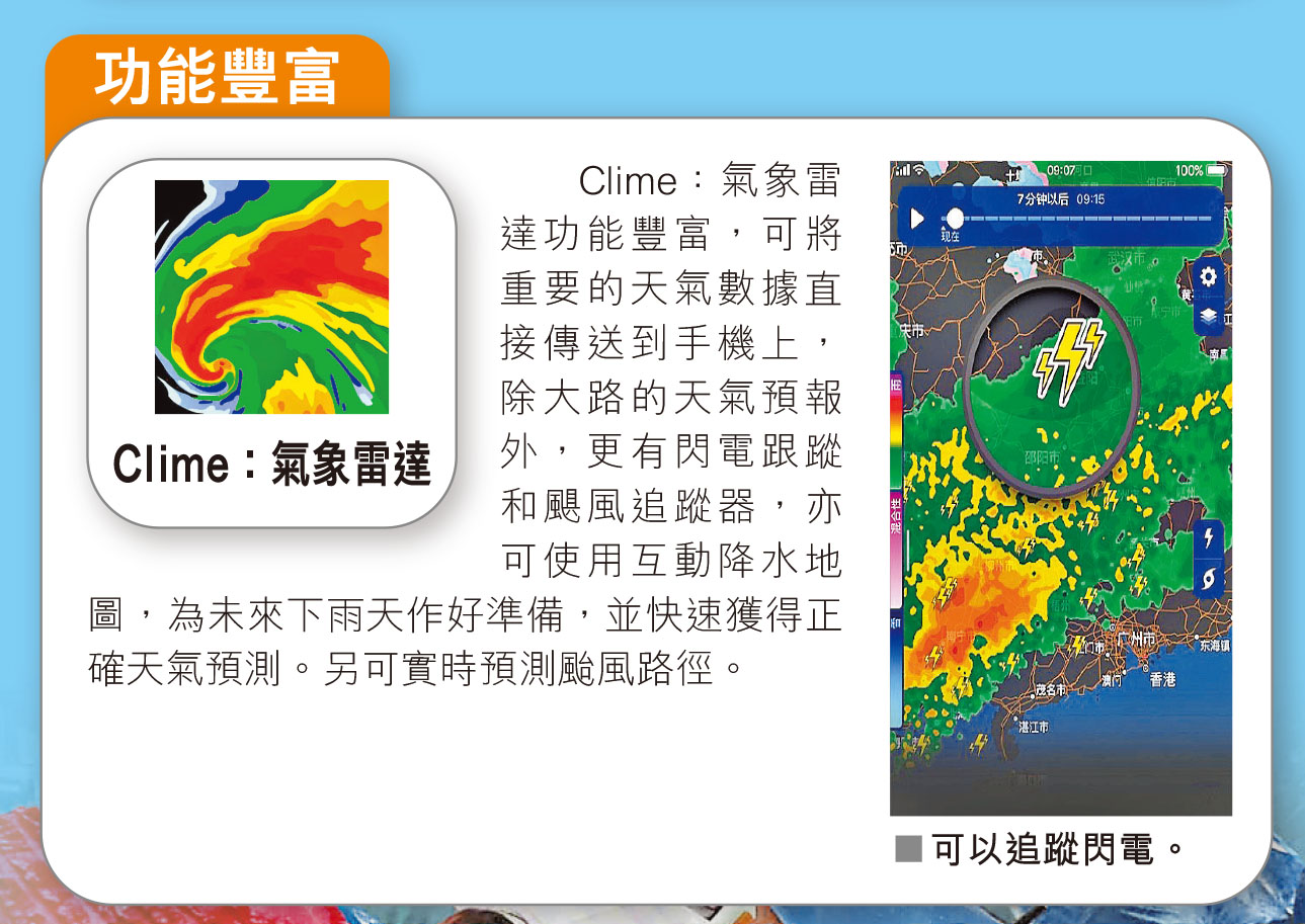 每逢5至11月都是颱風季節,香港都會遭受不同強度的熱帶氣旋吹襲。早前超強颱風蘇拉、海葵相繼襲港,導致水浸及山泥傾瀉。相信普羅大眾都不想出門大失預算,因此為大家介紹多款能實時追蹤天氣的手機App,包括「MyObservatory 我的天文台」、「Windy.com」、「AccuWeather 天氣預報」,以及「Clime:氣象雷達」,方便密切留意天氣變化。