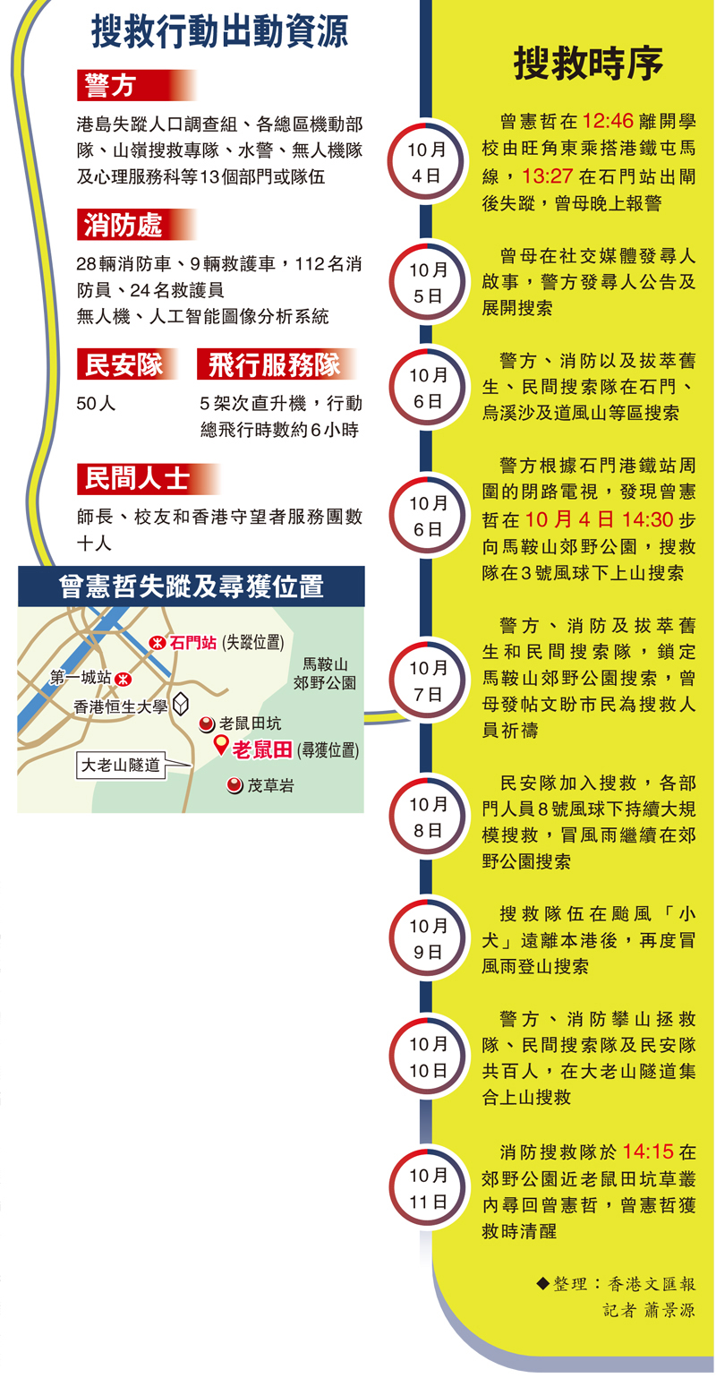 只要不放棄,就有希望!17歲拔萃男書院應屆DSE考生曾憲哲,本月4日離校後失蹤,警方將他列為高危失蹤者,相信他進入馬鞍山郊野公園,經歷強颱風「小犬」九號風球及黑色暴雨,父母焦急如焚,也牽動全城關注。警方、消防等組成跨部門搜救隊,加上熱心市民及民間搜救隊,連日來不放棄拯救生命的任何機會。經過多天海陸空大搜索後,昨日下午終於在馬鞍山郊野公園草叢內尋回飢寒交迫的曾憲哲。曾母形容兒子能生還是「神蹟」,她感謝政府各部門及社會各界的幫助,令她深深感受到港人的友愛和溫暖。 ◆香港文匯報記者 蕭景源