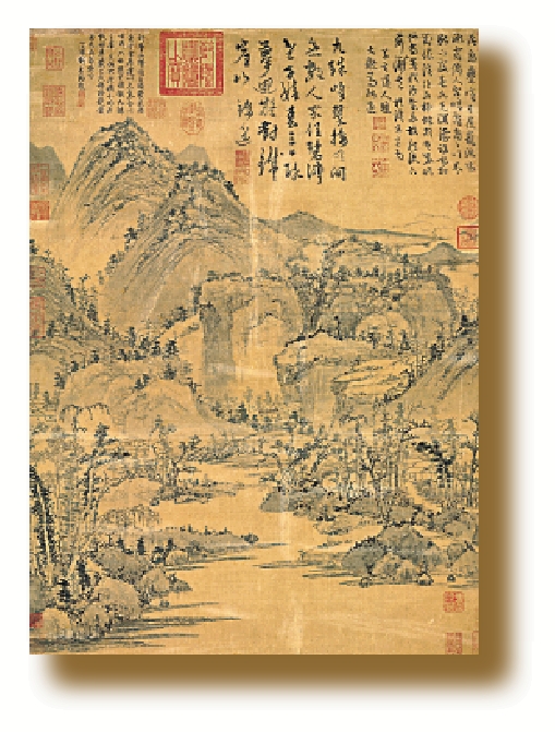 日前,台北故宮博物院迎來「國寶聚焦」換展,這次展出了元代黃公望的《九珠峰翠》(附圖,局部)。這件畫作沒有留下黃公望的題跋或是印記,但專家認為,通過元代楊維禎等人的題跋及畫中雲山、樹石、小屋等畫法,可以確定出自黃公望的手筆無疑。值得一提的是,《九珠峰翠》是畫在一幅有花紋的「綾」上,而不是繪於一般的紙或絹上,這也是目前所知畫在「綾」這種絲織物上的最早實例。
