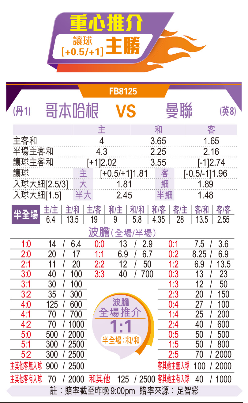 歐聯分組賽第4輪,A組榜尾戰丹超哥本哈根對英超曼聯,成為今晚焦點。曼聯目前3戰僅得3分,除今仗外,餘下兩輪需要作客加拉塔沙雷及主場對拜仁慕尼黑,搶分難度不比今仗低,若然今晚未能作客全取3分,出線形勢將相當被動,一旦輸波更基本上陷出局邊緣。不過曼聯雖有鬥志,但開季至今表現仍全無說服力,面對主場踢歐聯極度硬淨的哥本哈根,要讓半一實在過分,推介主隊下盤。(NOW 643台周四4:00am直播)