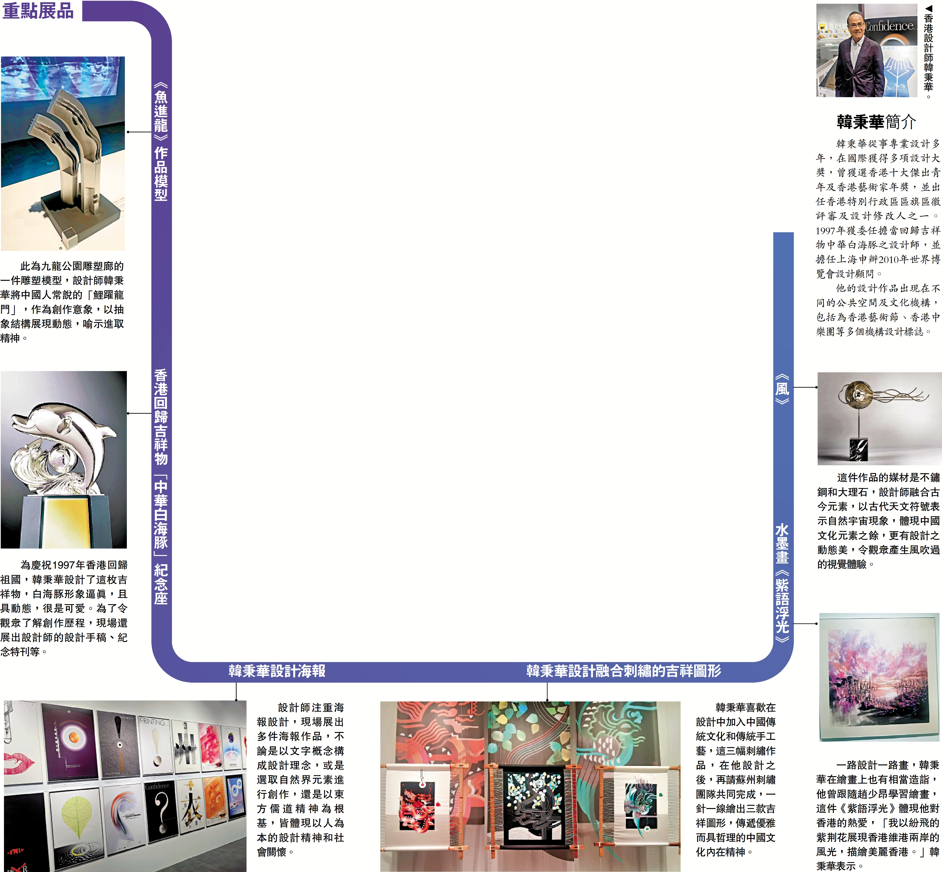 一路設計一路畫,韓秉華在繪畫上也有相當造詣,他曾跟隨趙少昂學習繪畫,這件《紫語浮光》體現他對香港的熱愛,「我以紛飛的紫荊花展現香港維港兩岸的風光,描繪美麗香港。」韓秉華表示。