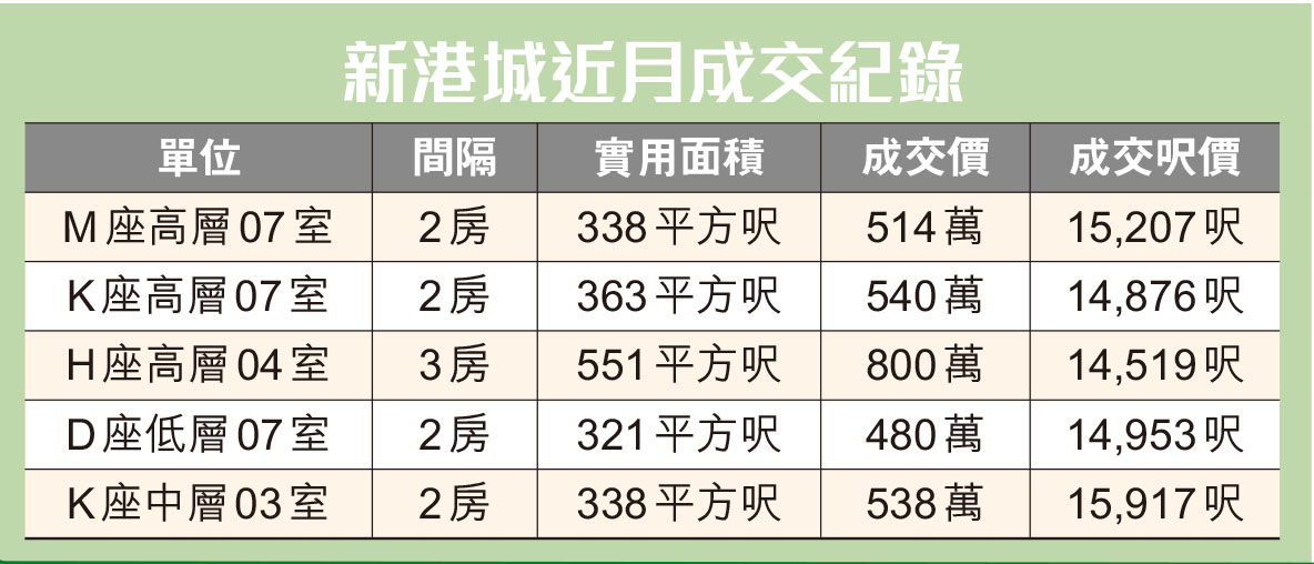 中原地產馬鞍山豪宅迎海御峰分行B組分區營業經理林志明表示,是次放盤兩房單位間隔四正實用,所處環境優美寧靜。他續稱,新港城整體現有193個放盤單位,整體平均成交實用呎價為15,000元。買家方面,兩房戶主要是上車客,三房戶則為換樓客。