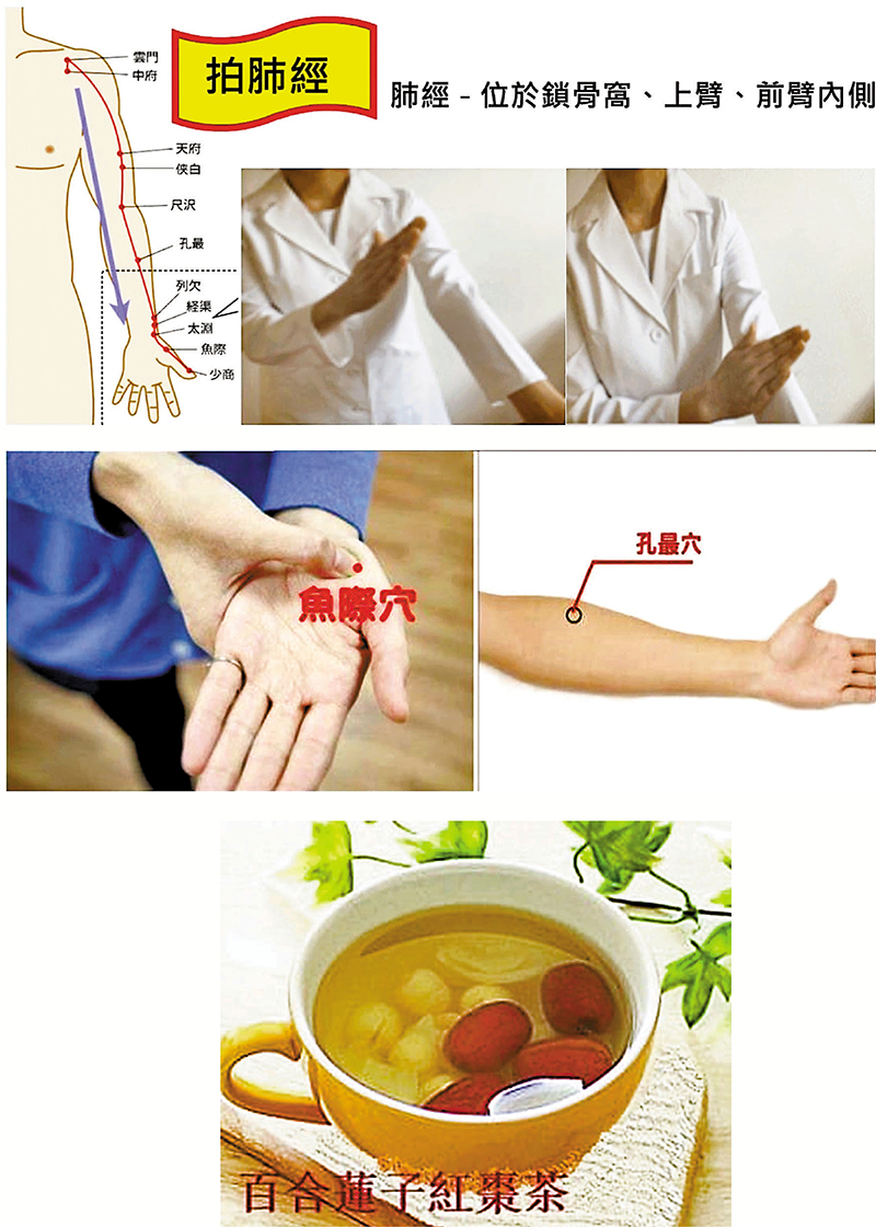 拍肺經步驟:將手前臂平舉,掌心向上,另一側手握空拳,沿前臂掌面小拇指一側往肘部輕拍,進而輕拍沿上臂至胸前,來回拍3至5次。早晚輕拍左右手各50次。