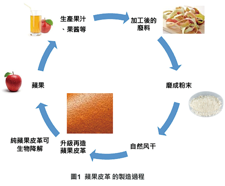 從製造蘋果果汁、果醬等加工後的廢料如果渣和果皮製成。其製造工序是首先將回收的蘋果皮清潔、烘乾、磨成粉末後或與其他天然纖維混合,或通過與聚氨酯(PU)混合,跟着塗在純棉面料上,再壓制皮紋、烘乾等工序(如圖1),製造比較耐用、環保、透氣的仿皮,觸感光滑,現時生產商正着手採用可生物降解的PU來取代一般合成PU、有機/生物色素等來令蘋果皮革更純素及環保材料。蘋果皮革特點包括:(一)使用生物基廢棄,減少廢物處理及碳排放、(二)原料沒有取材於動物、(三)因性能不上動物皮革,尚未廣泛被應用、(四)售價比動物皮革便宜。